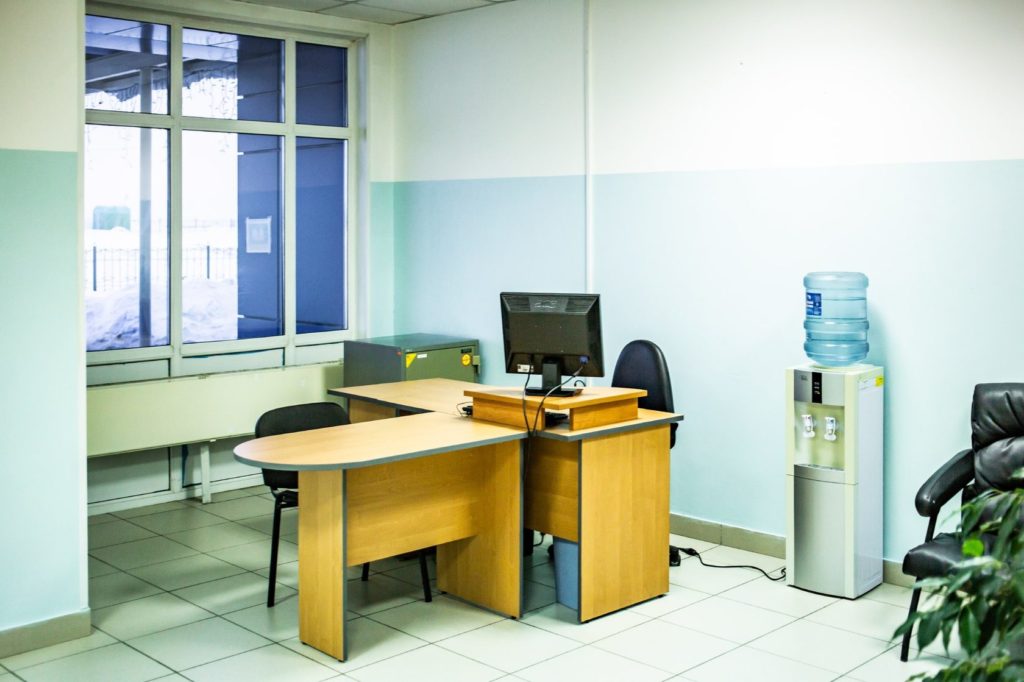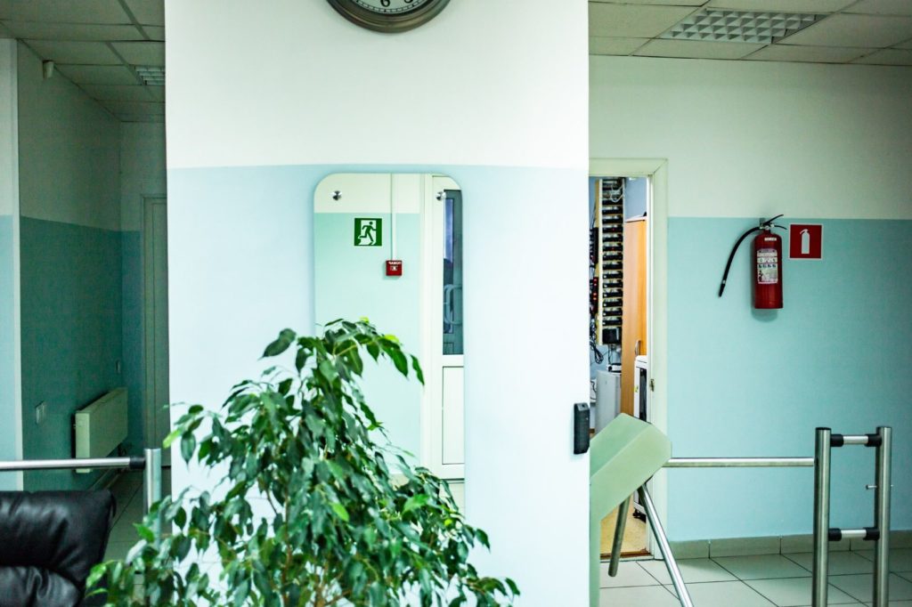 В сером здании под вывеской — административный центр и гостиница на 30 мест. В небольшом холле с голыми стенами никого нет. Стойки регистрации тоже не оказалось, вместо неё на входе установлен массивный турникет. Охранники долго ищут администратора, которая появляется в норковой шубке и сапогах.