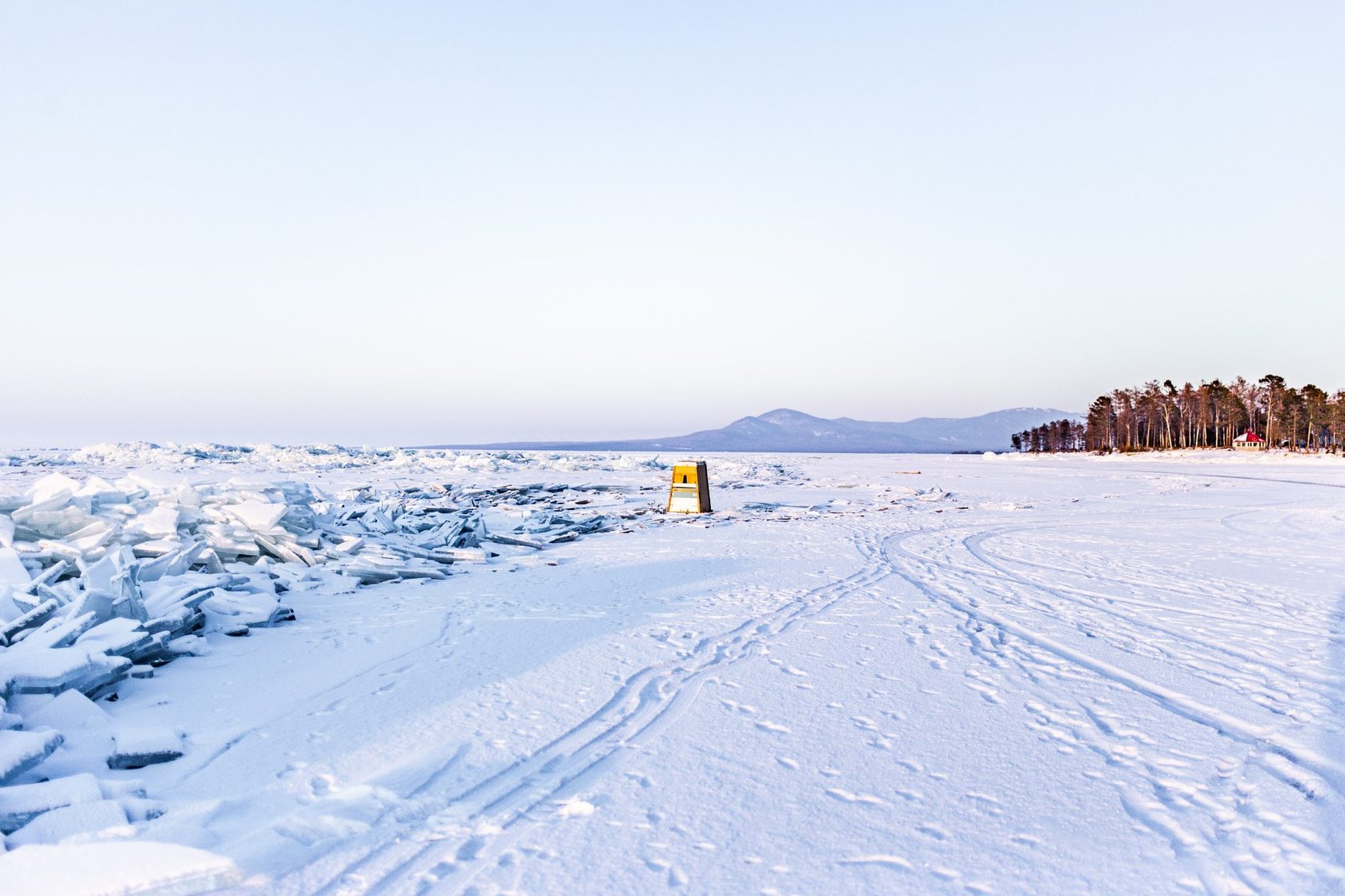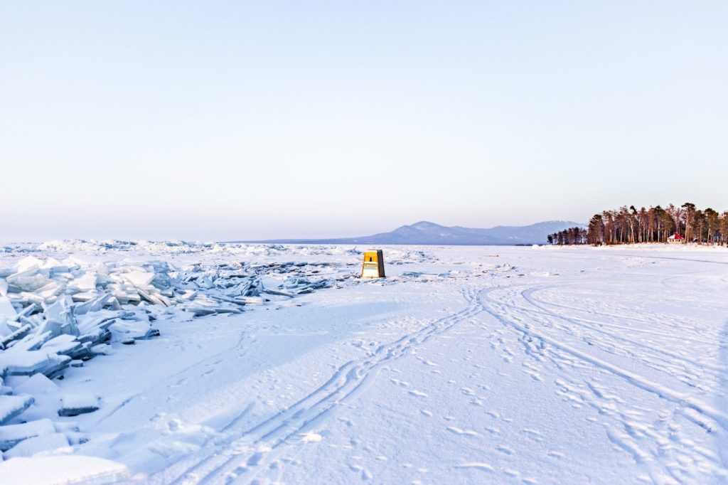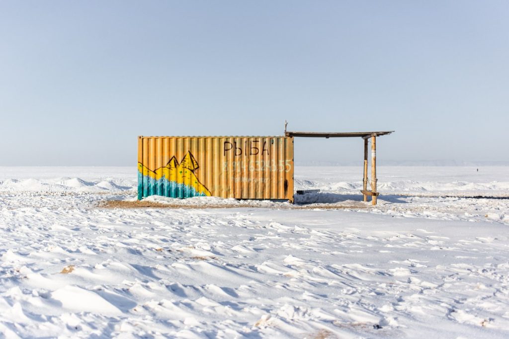 Рыбак в самодельном домике на Байкале