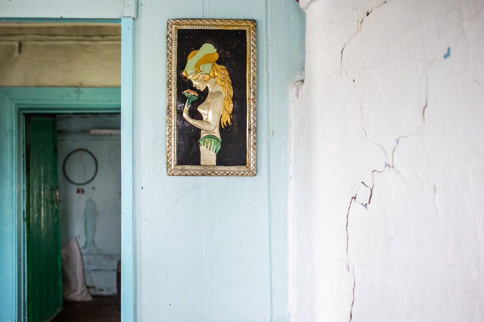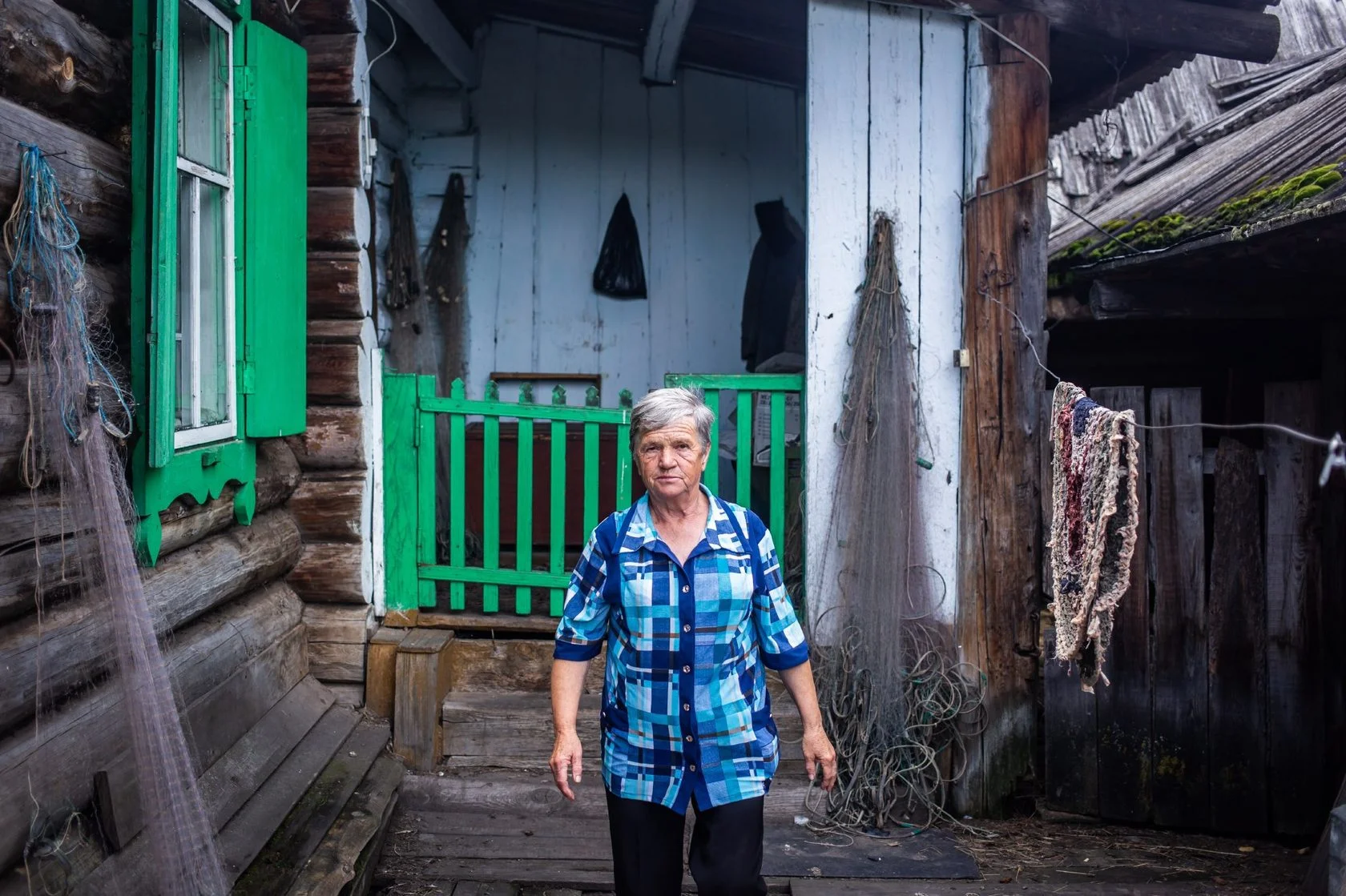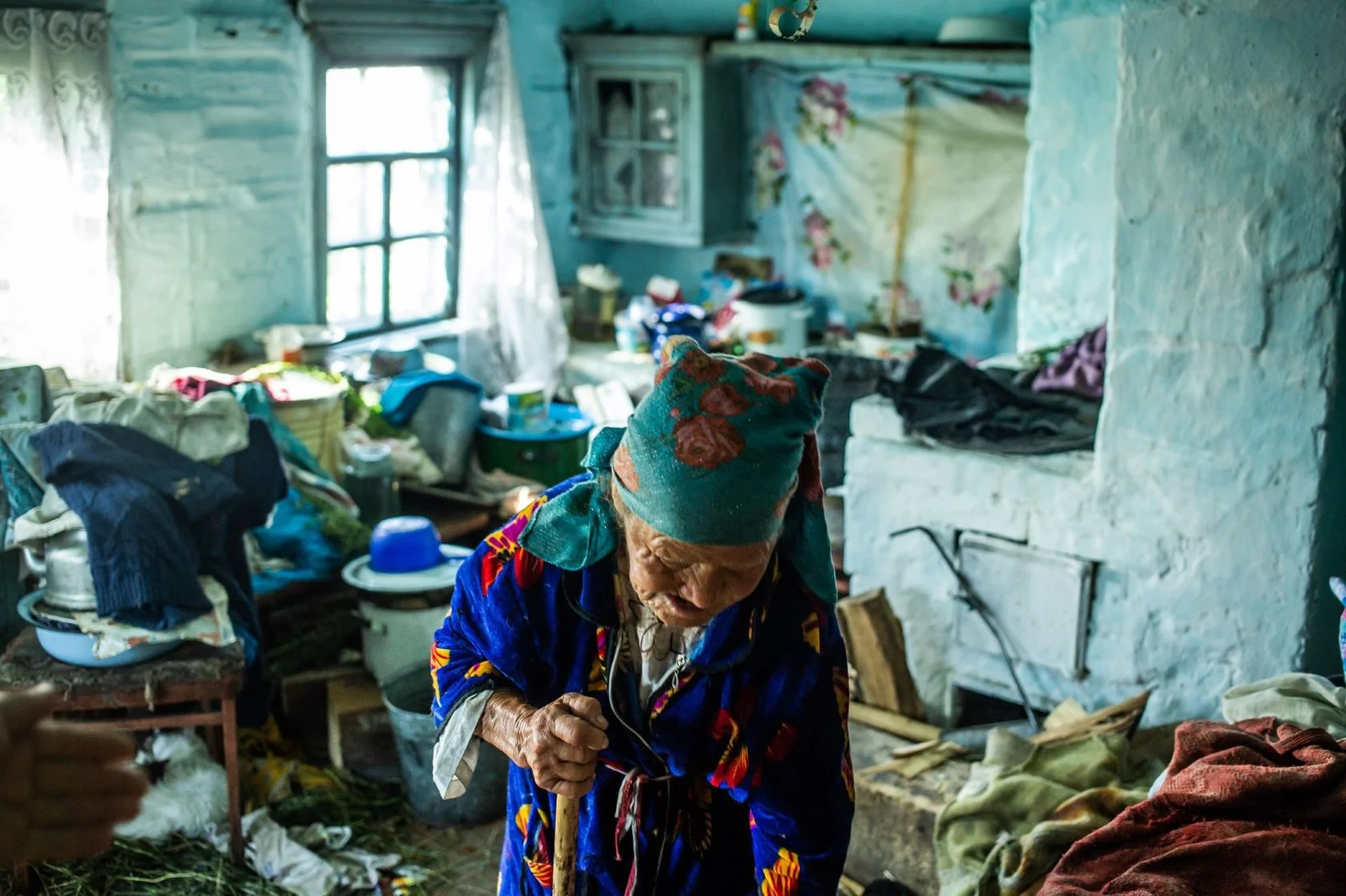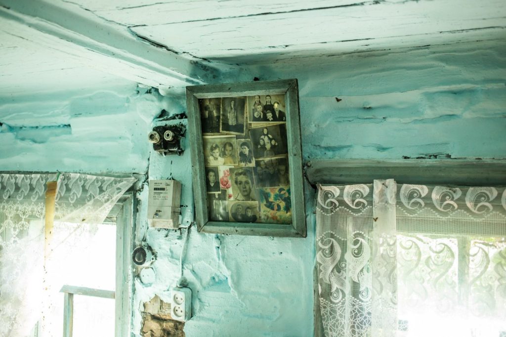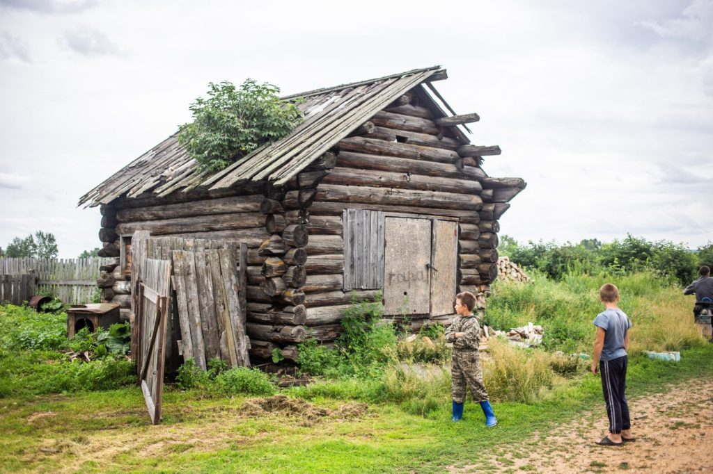 В избушке стоит резкий запах нечистот. Вдыхаю его, и горло перехватывает спазм. Около входа — цинковая ванна с чёрной водой, у печки кучей навалены поленья. Сверху на них брошены жжёные тряпки и сухая трава. По дому ходят несколько худых кошек, на газете под столом для них лежит корм — картофельные очистки. Продуктов в шкафчиках нет, чистой воды тоже. Но стены в единственной комнате недавно побелены, на столе — ромашки в банке с водой, небольшое зеркало, открытка с изображением белого котёнка. На полочке-божнице большая икона Богородицы, перемотанная шнуром. Рядом на стене старинные фотографии в раме. Это родители бабы Мани, её умершие родственники.