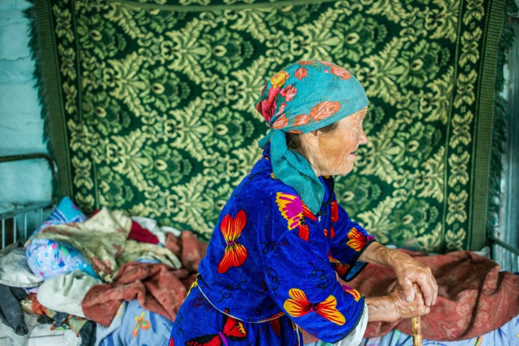 На лавочке у покосившегося дома сидит 83-летняя Мария Урчегова. Она живёт одна в деревне Тахтамай. На ней синий халат с жёлтыми бабочками, концы выцветшего зелёного платка перекручены и завязаны сзади. Баба Маня почти ничего не слышит. Говорит она невнятно и быстро, отдельные слова можно разобрать с трудом. Общаться с ней лучше записками, она умеет читать и писать печатными буквами.