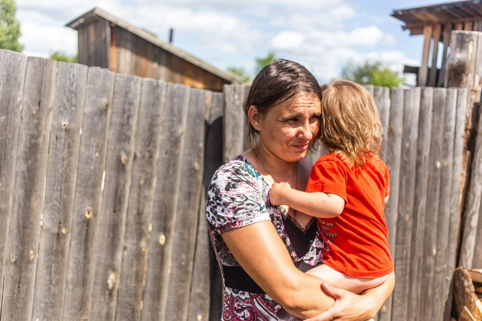 Младшей дочери Надежды год и девять месяцев. Сыновьям 13 и 15 лет. До декретного отпуска Надежда подрабатывала сторожем на китайской пилораме. Помогать Надежде некому. Родители живут в посёлке Выдрино в том же Чунском районе. Там осталось всего пять домов. Нет электричества, связи и дорог. Транспорт туда давно не ходит. В прошлом году сын Надежды гостил у бабушки и дедушки и сильно порезал руку. «Скорая помощь» ехать в Выдрино отказалась. Дорога от Выдрино до Чуны занимает семь часов. «Сказали, что слишком дорого, — рассказывает Надежда. — Пришлось нанимать вездеход за 10 тысяч рублей, чтобы вывезти ребёнка в больницу».