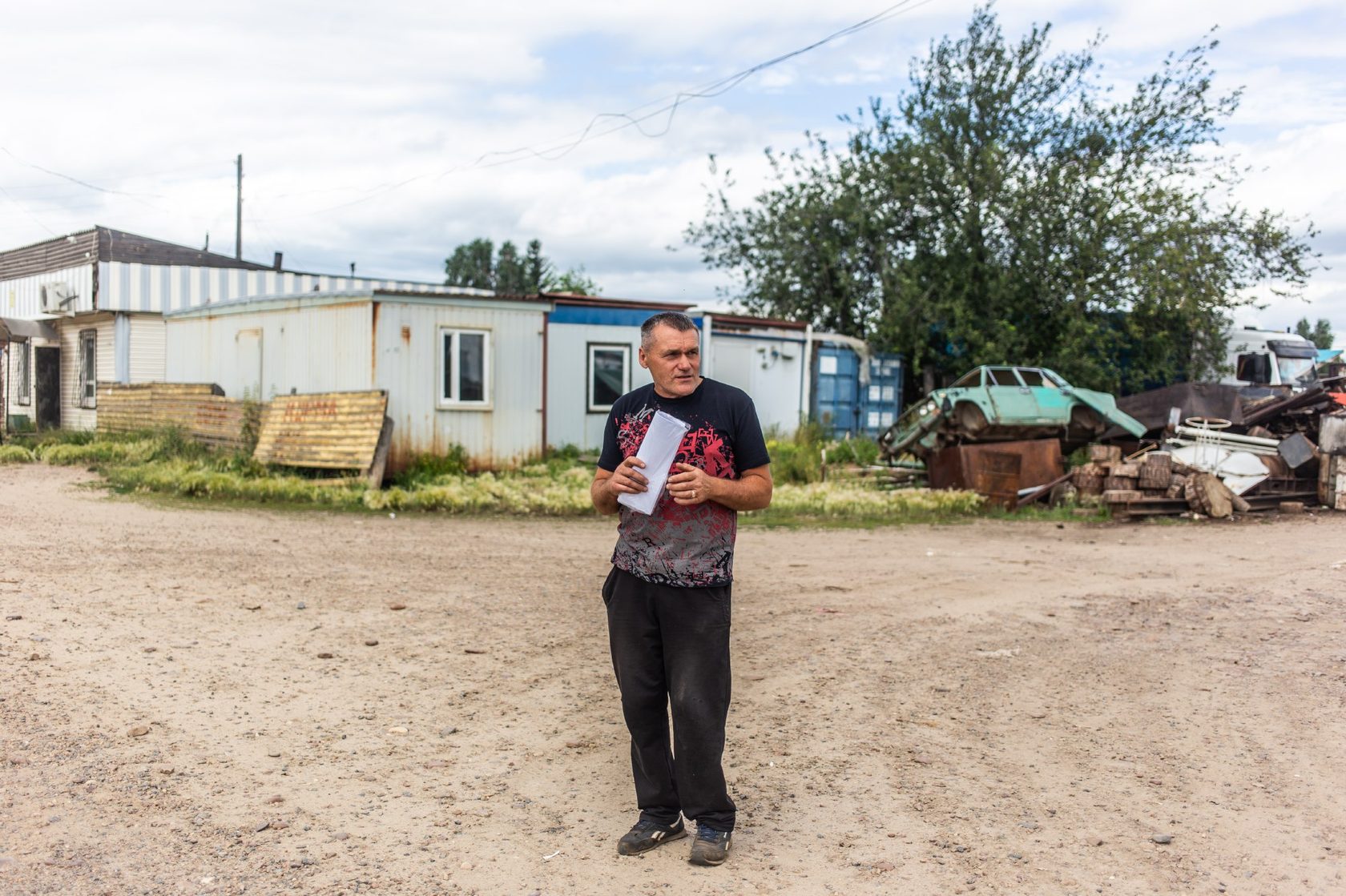 Рядом с детской площадкой Гриб устроил склад металлолома. Там стоят старые строительные вагончики, автобусы без окон и без колёс, ржавые автомобили и прочий неликвид. Для Алексея это ещё один вид бизнеса. Ему не кажется, что это опасное и неподходящее соседство для детской площадки. Он говорит, что собирается всё это вывозить в другое место. Просто пока ещё не решил, будет ли продавать бизнес в Октябрьском. Сам он собирается переезжать в райцентр Чуну.