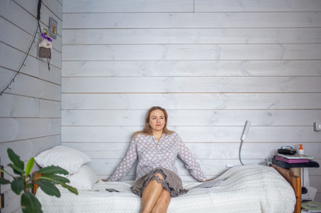 Её блузка того же оттенка, что и цвет стен в её доме — светло-серая. Елена ровно прижимает стопы к полу, как будто тянет носочек, поэтому немного напоминает балерину. Всю жизнь она занималась спортивной гимнастикой, участвовала в международных соревнованиях. Свою историю Плохова рассказывает медленно, её голос слегка дрожит. Перед тем, как ответить на новый вопрос, она делает глубокий вдох.