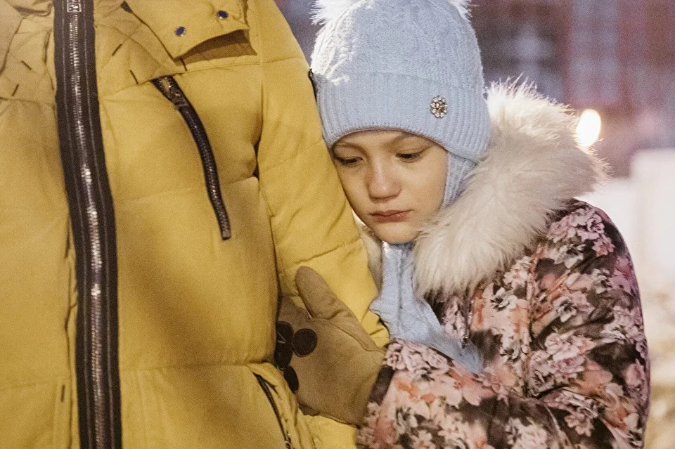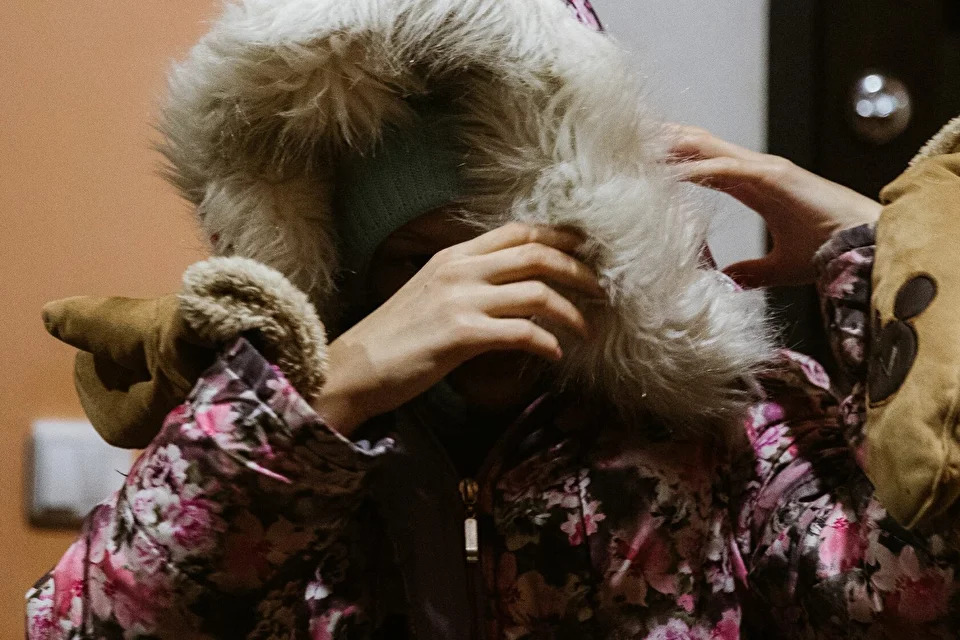 Маша собирает руки на груди, как в молитве, и улыбается. Через несколько минут она, стоя на пороге квартиры в куртке, наклоняется к ботинкам. Помпоны её синей шапки-ушанки свисают почти до пола. Девочка непослушными пальцами застёгивает молнию, громко кряхтя. Через пару минут она выпрямляется, завязывает висящие помпоны в узел и говорит маме: