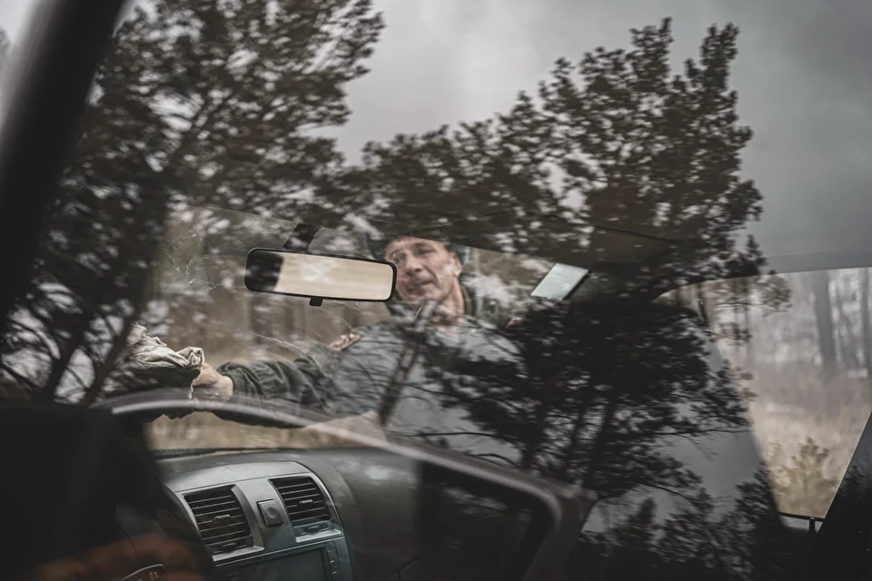 Сейчас он показывает на земле следы шин, резко уходящие от основной дороги к косогору. Они впечатались в грязную траву: «Вот я тут стоял, этот автомобиль — на меня. И дальше поехал, между деревьями. Потом, видать, увидел нашу машину. Крутанулся через овражек — и сюда. Я думал, что он перевернётся, почти встал на два колеса. А потом люди начали выпрыгивать из него на полном ходу. Там нашлись две шапки, их потеряли. А тут — нож охотничий и патроны: от них избавлялись».