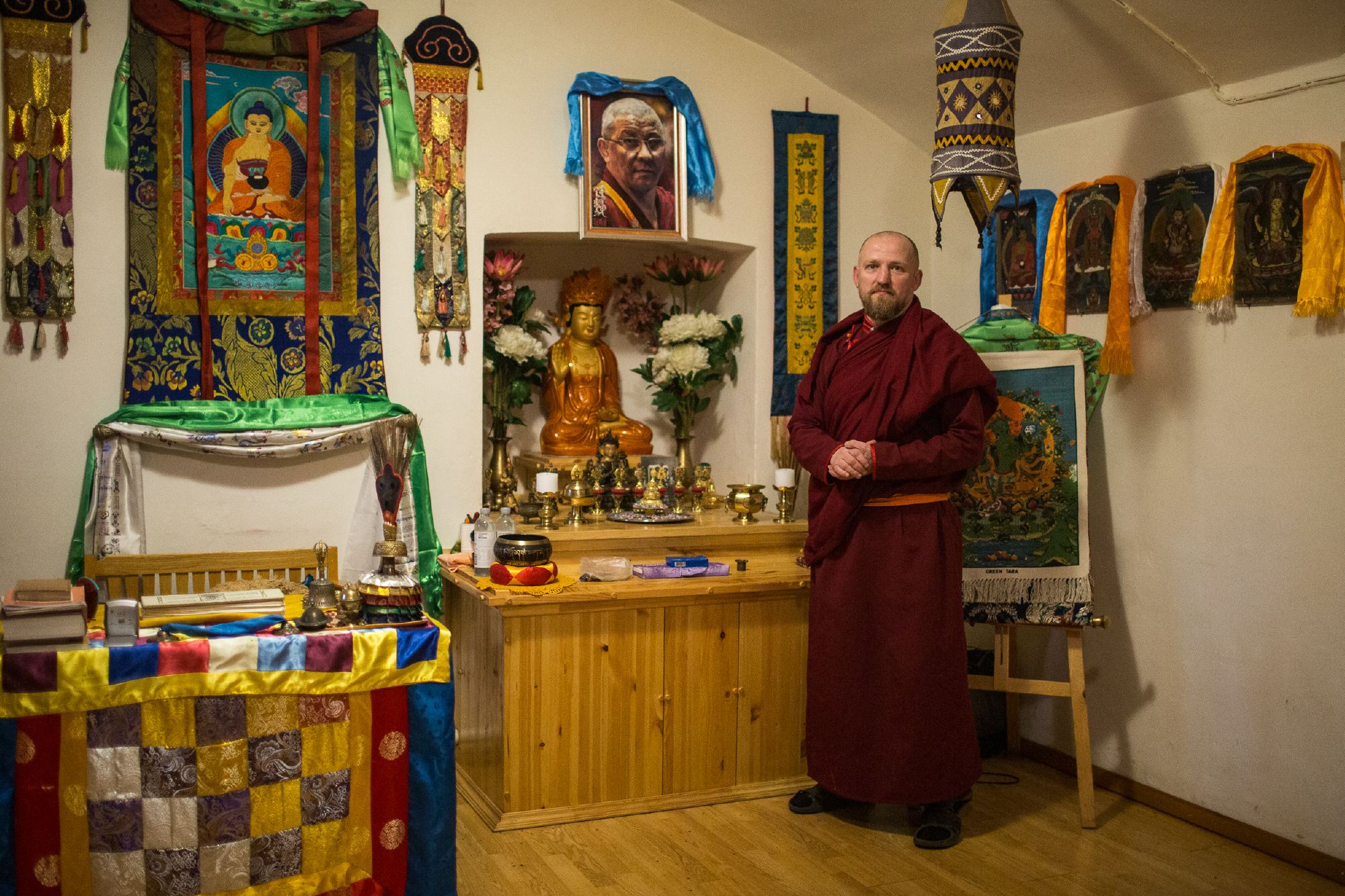 Скромный кабинет Антона-ламы в цокольном этаже дацана украшен изображениями Будды, Белой и Зелёной Тары, портретом настоятеля. И посреди этого красно-золотого великолепия — громкоголосый рыжий сероглазый мужик в красном халате. Это самый экзотичный лама петербургского дацана. Он принял Прибежище — то есть приобщился к учению Будды и буддистской общине — в 25 лет. В дацане он 17 лет, из них пять лет был прихожанином.
