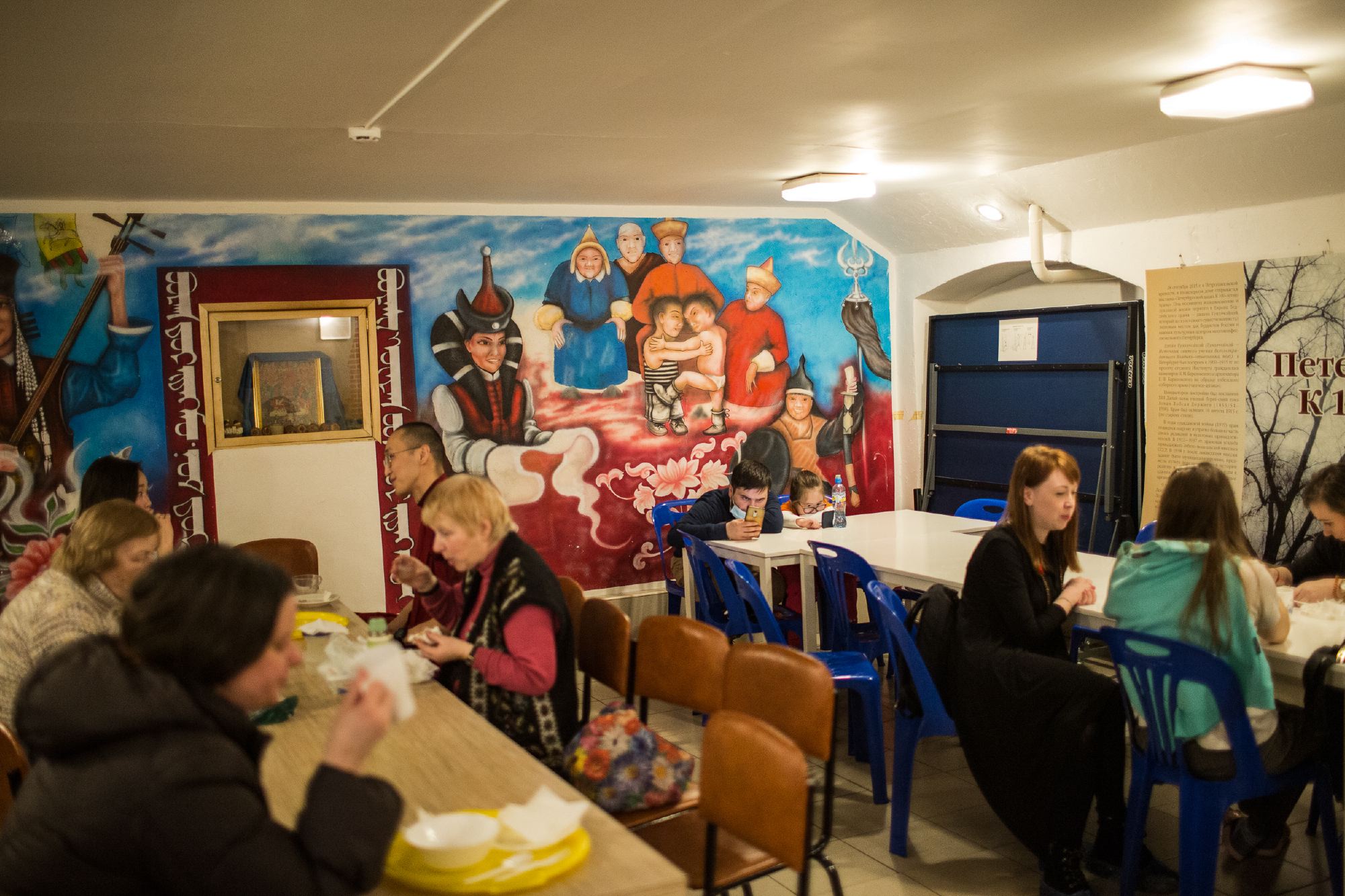 — Заходите, я вас буузами угощу, — 59-летний прихожанин дацана Ринчин Демидов ведёт в скромную столовую дацана в цокольном этаже. Буузы — бурятское национальное блюдо, мясо завёрнутое в тесто и приготовленное на пару.