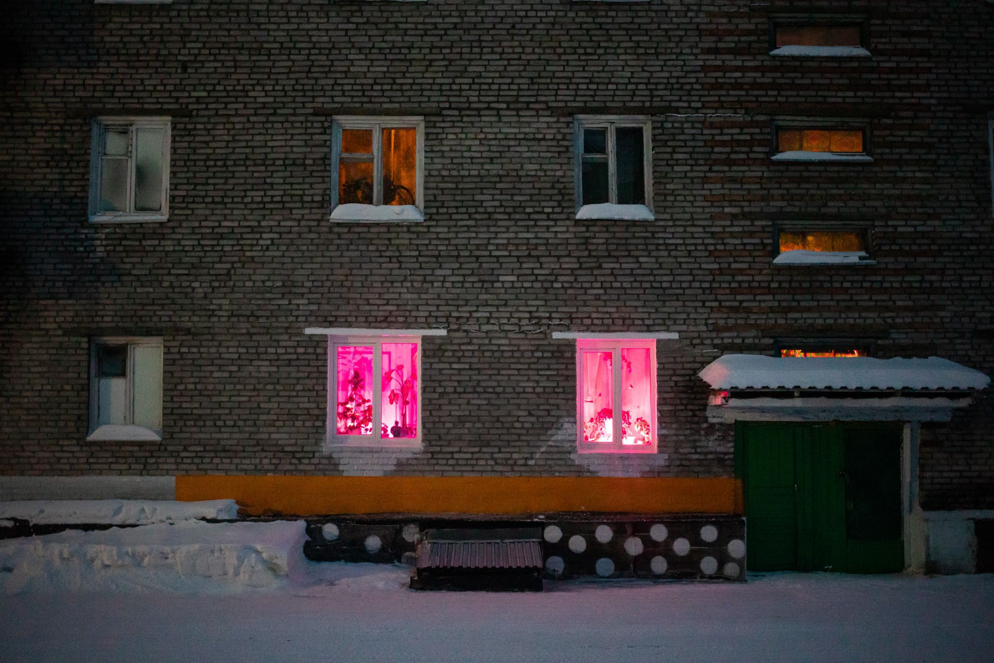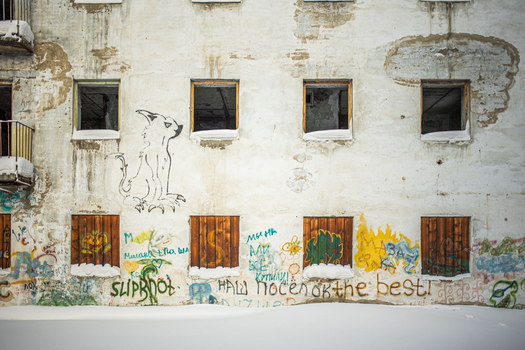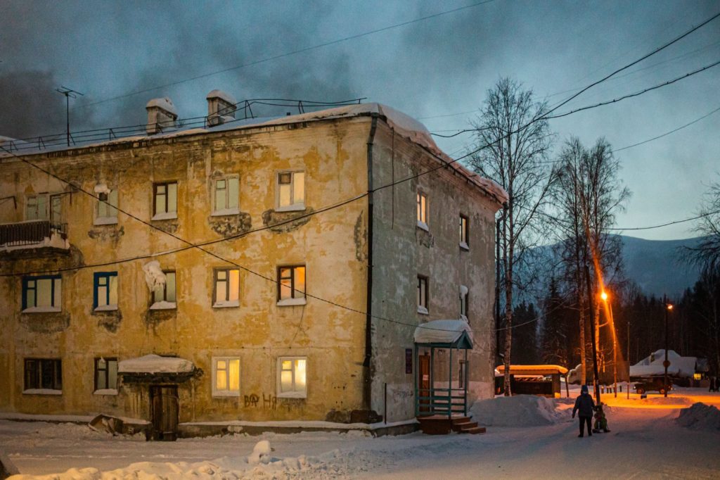 У соседей есть ещё один общий враг — трещина, которая дугой проходит по стене через все этажи. Жильцы рассказывают, что их дом разорвало на две половины в 2008 году, когда разморозили и закрыли один из подъездов. Случилась авария, в доме отключили отопление. Из-за этого в квартирах, которые стояли пустыми, лопнули трубы. Власти решили не ремонтировать отопление, а отрезать подъезд от сети. Несколько семей, которые жили в этой части дома, переселили в другие квартиры. Окна первых этажей и двери подъезда заколотили досками. Для жителей Мамы это обычная история. Отрезают от отопления не только подъезды, но и целые дома. Пустыми глазницами окон на улицу Советскую смотрит соседний дом — единственная в посёлке четырёхэтажка. «У слюдяного края юбилей» — нарисованные буквы на стене с пустыми проёмами окон едва видны.