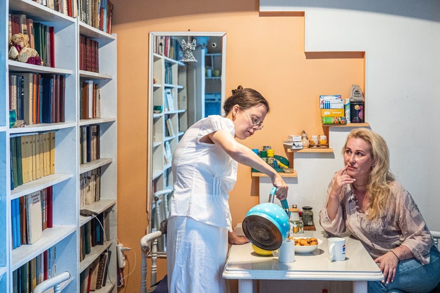 На Низовкиной — жёлтый сарафан с белыми цветами, в ушах — подобранные к сарафану жёлтые серёжки. Надежда ставит на старую плитку новый металлический чайник-«свисток», голубой в белую горошину. Надежда специально искала такой чайник, она хотела, чтобы на нём были горошины. Она любит эстетику во всём — в кухонной посуде тоже.
