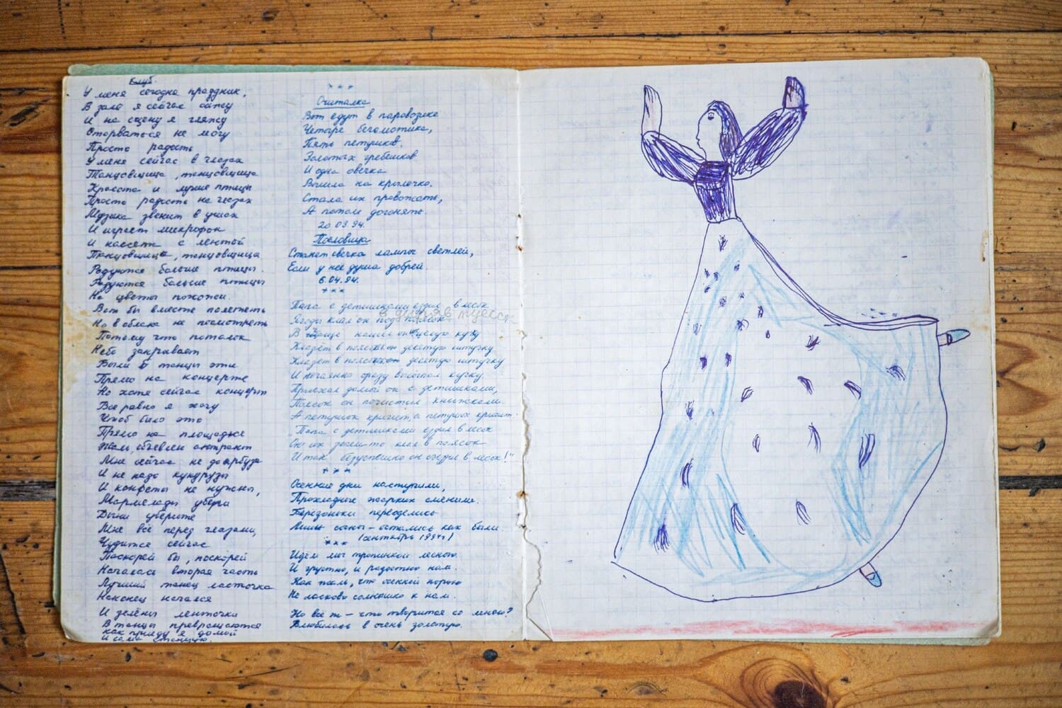 После развода родителей Надежда начала придумывать стихи. Мать завела специальную зелёную тетрадку, куда записывала сочинения дочери. Низовкина хранит её до сих пор. На обложке написано: «Надины стихи». На первой странице — двустишие «Вертится вертушка, ну а рядом — кружка!» Буквы выведены чётко и красиво, с нажимом. Через несколько страниц — рисунок самой Надежды. Она изобразила девушку с узкой талией, длинными ногами, в огромной развевающейся юбке. Та как будто летит вперёд.
