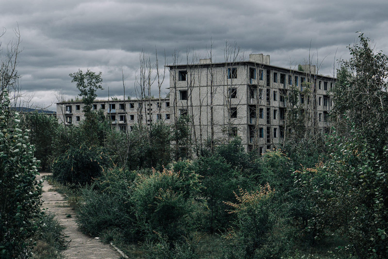 Полностью пустых пятиэтажек в посёлке — семь. Ещё часть домов жива наполовину: в нескольких подъездах квартиры целы, а в нескольких — нет.