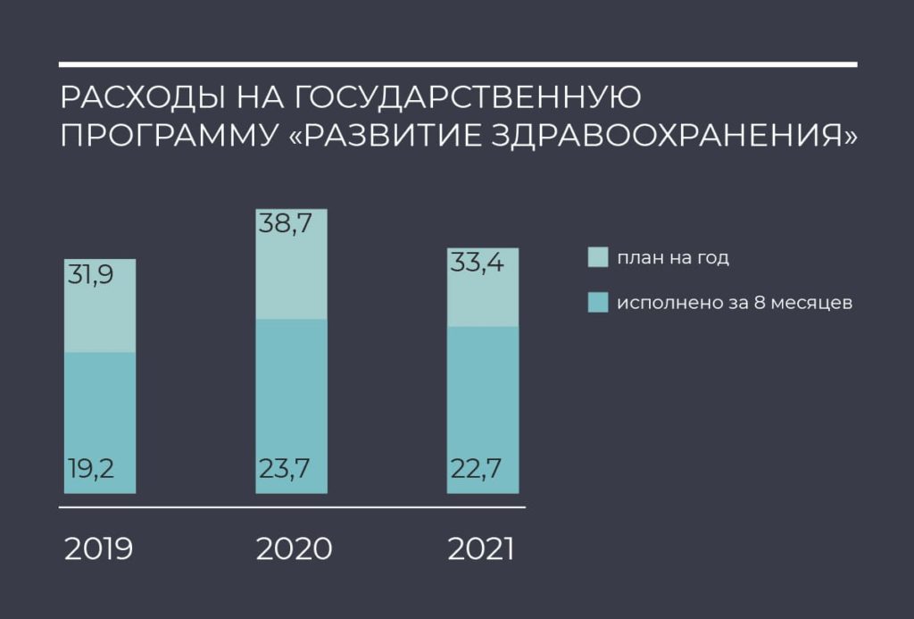 Тут нужно ещё отметить, что исполнение за 8 месяцев составило 68% от запланированных расходов за год. Расходование средств на здравоохранение идёт более высокими темпами и в сравнении со всеми другими расходами бюджета, и в сравнении с предыдущими периодами. Это как раз говорит о высоких потребностях в финансировании отрасли.