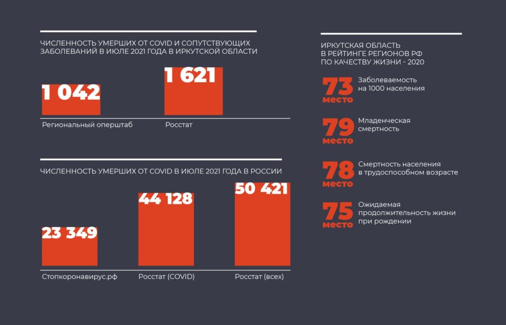 Согласно официальным заявлениям, Иркутская область в июле почти две недели занимала третье место по суточной смертности пациентов от ковида. Выше были только Москва и Петербург. Причём это не в расчёте на одного жителя, а в абсолютных величинах.