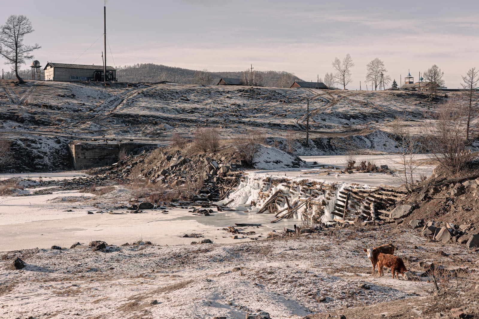 Баянгол и социальную деревню разделяют речка, овраг и поле, на котором находятся развалины старой электростанции