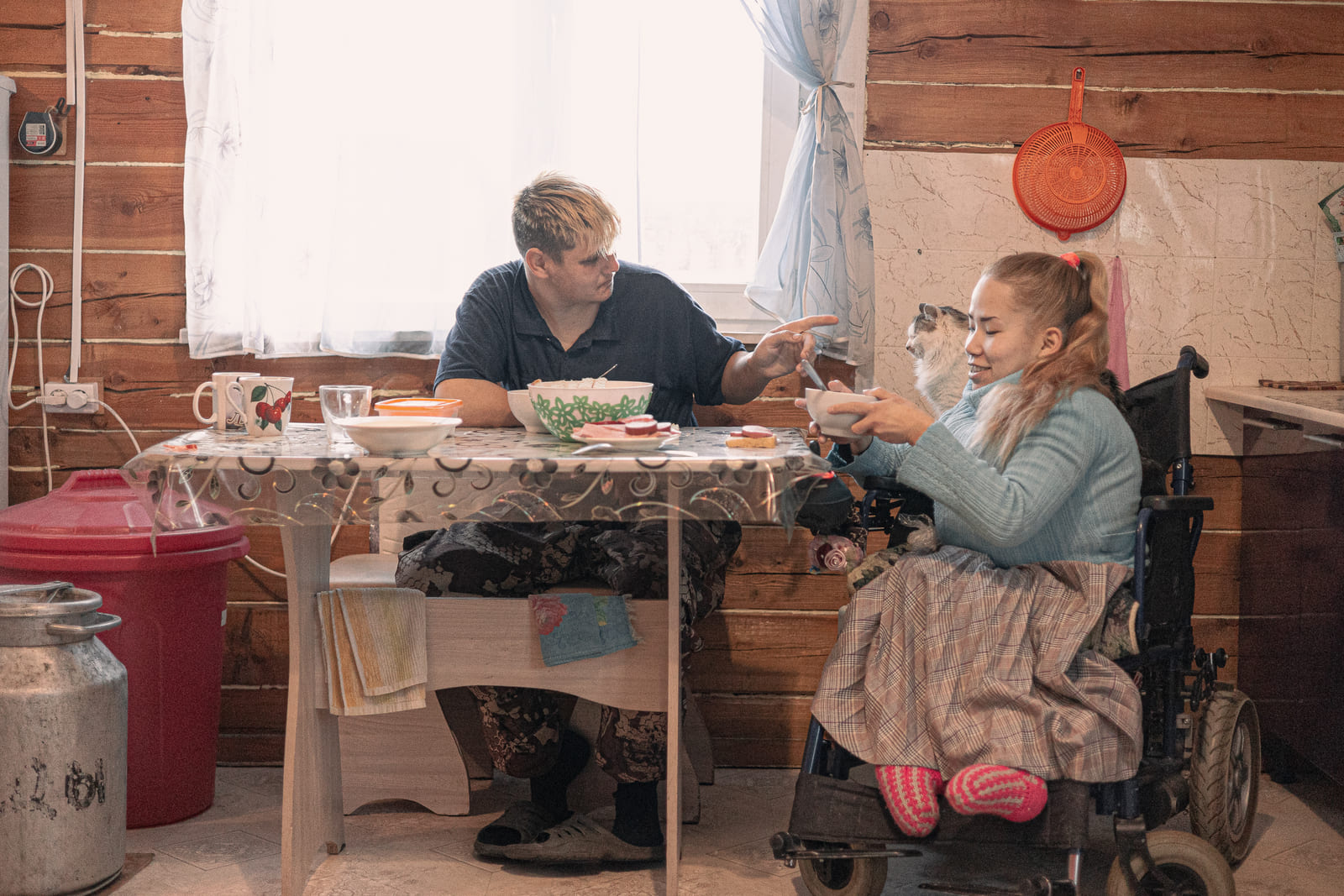 В соцдеревне живёт только Жаргалма, её муж Иван и её подопечные. Больше никого — только иногда приезжают две нянечки из интерната. Они обходят квартиры и помогают подопечным — кому с уборкой, кому с приготовлением еды.