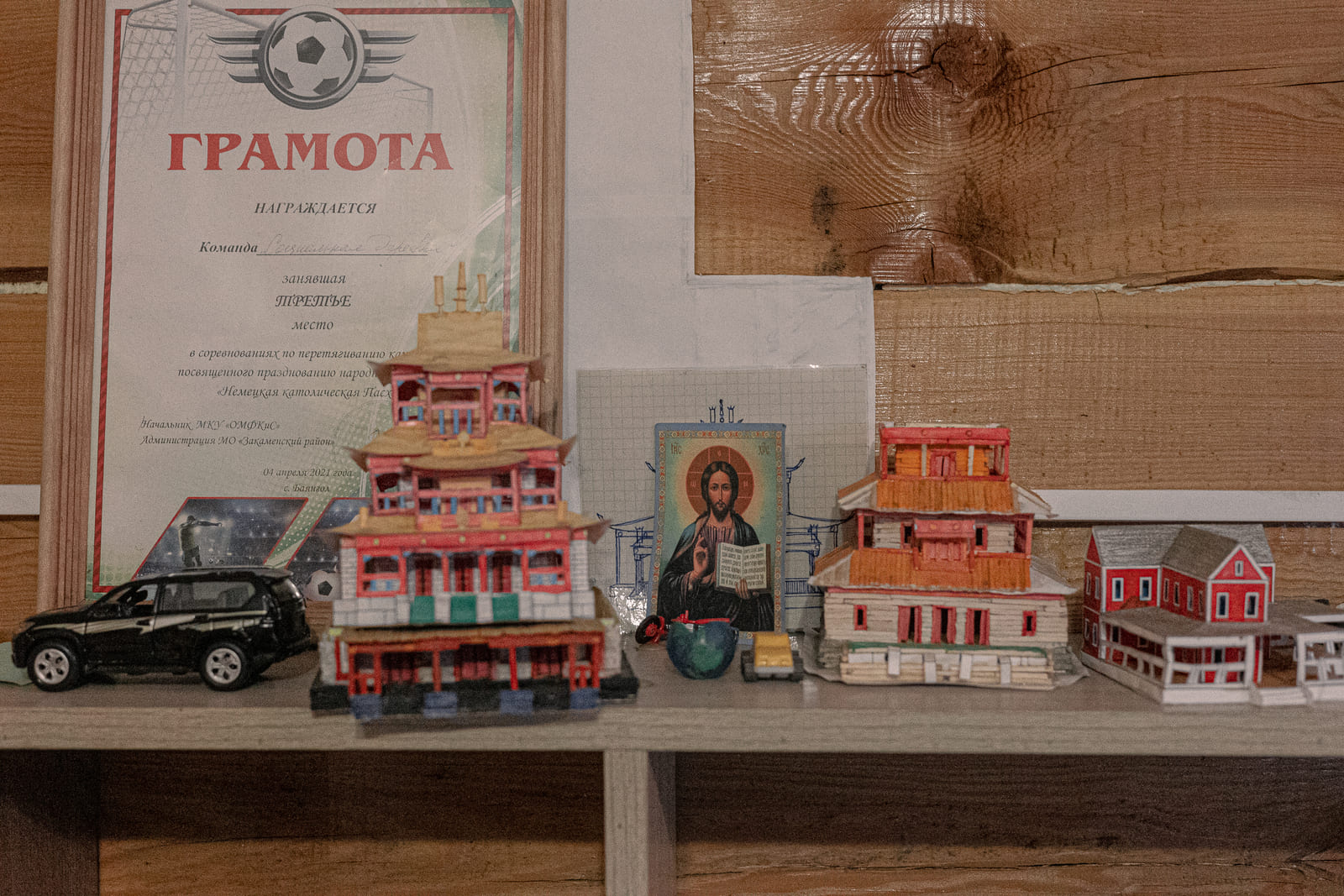 Ольга рисует, Дима вяжет, Андрей вырезает деревянные мечи, а Женя — делает из спичечных коробков модели домов и буддийских храмов