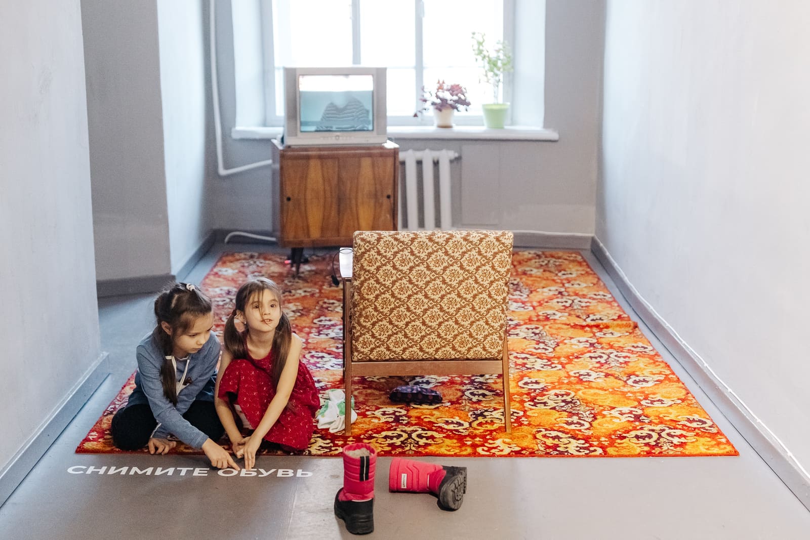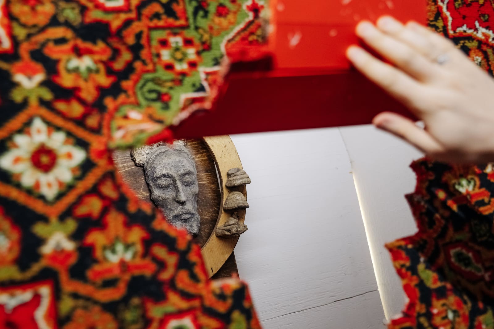 Отдельными экспонатами стали инсталляции из ковров. Они до сих пор остаются почти непременным атрибутом каждого деревенского дома и несут в себе сакральный смысл. На выставке можно заглянуть в деревенское «заковёрье». Ковры здесь закрывают окна, но если заглянуть в специально сделанное отверстие — в «заковёрье» можно увидеть самодельные иконы, привезённые из брошенных домов. Они так же, как ковры, висят в красном углу любого деревенского дома и свидетельствуют о самом сокровенном и глубинном.