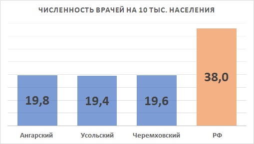 При этом обеспеченность населения врачами на всех трёх территориях примерно одинаковая — в два раза ниже, чем установленный нацпроектом показатель.