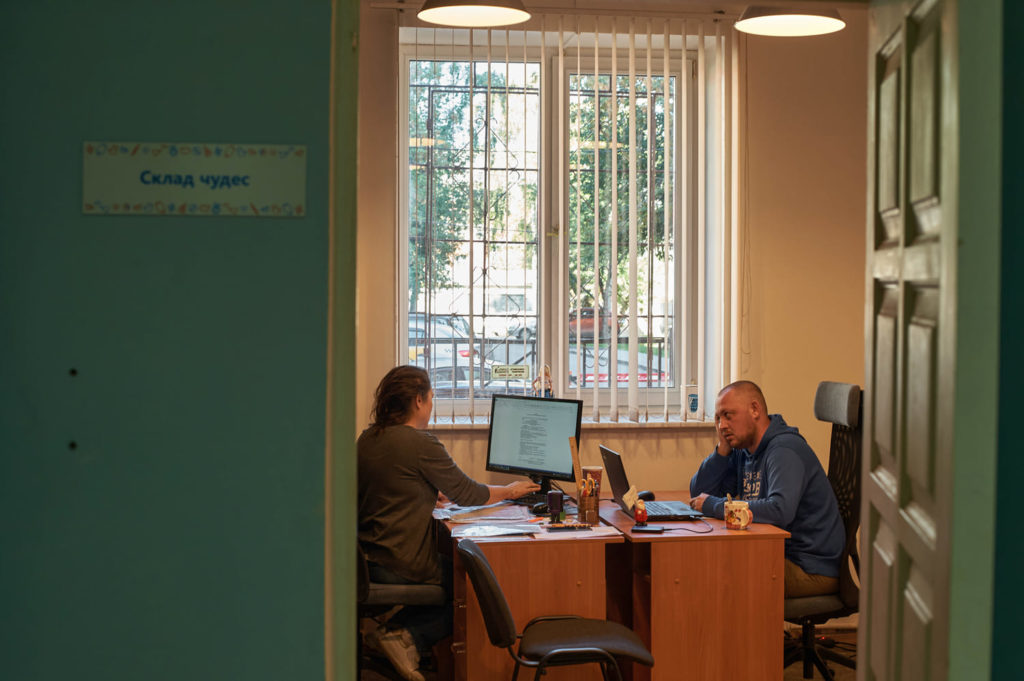 Мебель из «Икеи» в офисе собирала Надежда. «Один раз работал шуруповёртом — палец мне чуть не насквозь проткнул», — говорит она про Дмитрия.
