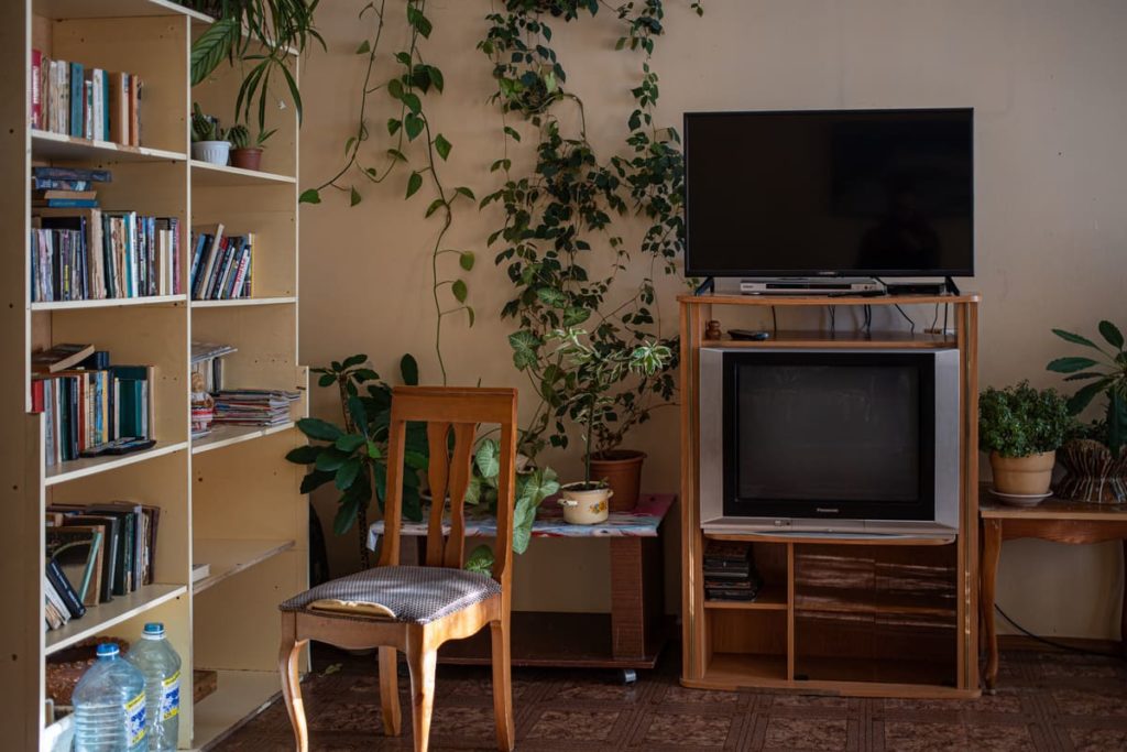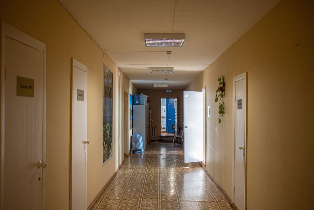 Если заглянуть в окно, всю больницу можно увидеть насквозь до противоположного окна. Чтобы попасть внутрь, надо пройти через застеклённую веранду. Здесь стоят диван и кресла — чтобы пациенты отдыхали на свежем воздухе. Дальше — небольшой «предбанник», из которого попадаешь в длинный коридор с белыми дверями, застеленный коричневым советским линолеумом.