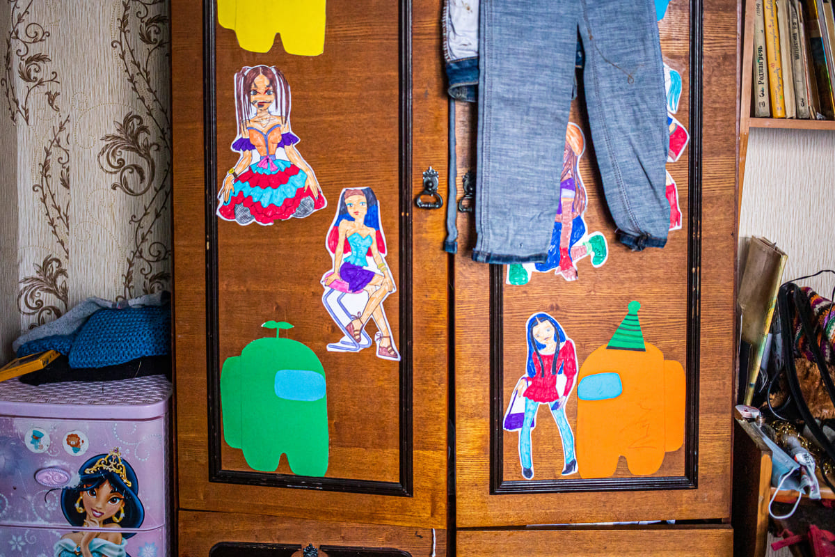 Комната девочки из посёлка Мусковит Мамско-Чуйского района. Интересно наблюдать, какие образы наполняют жизнь подростка. Чтобы украсить комнату, девочка приложила усилие: раскрашивала, вырезала и наклеивала на шкаф картинки.