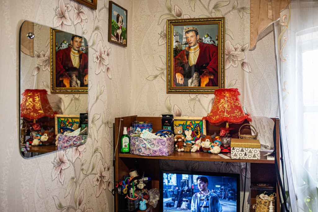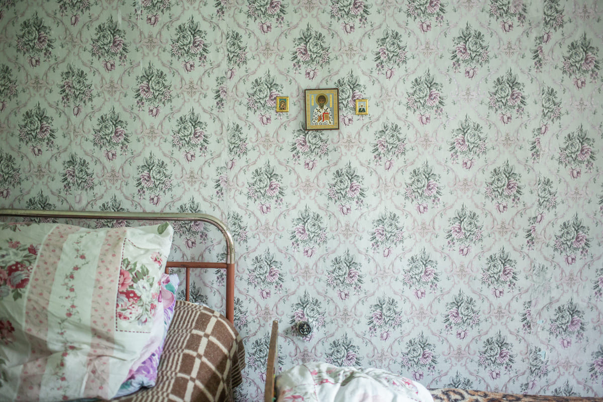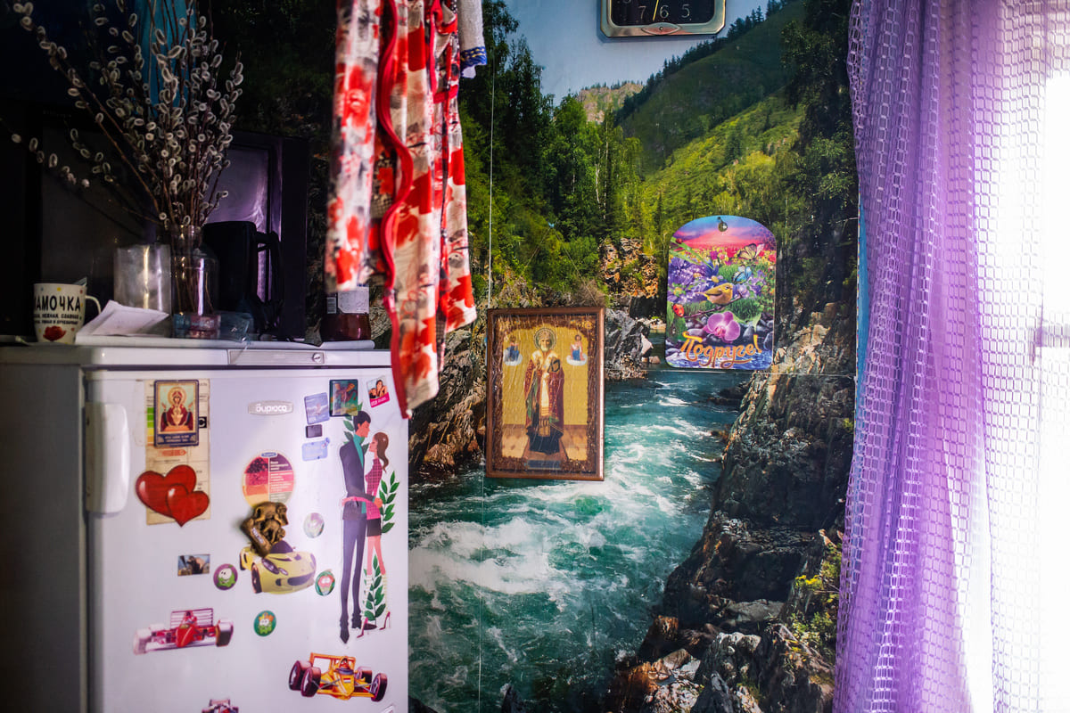 Эта фотография с иконой на фотообоях, а также заглавная, с медведем, особенно привлекательные для меня из этой подборки. В них много деталей, сочетаются казалось бы несочетаемые вещи. Обе фотографии сняты в одном доме в деревне Кумарейка в Балаганском районе. Мы приезжали к одной старушке вместе с фельдшером скорой помощи на вызов.