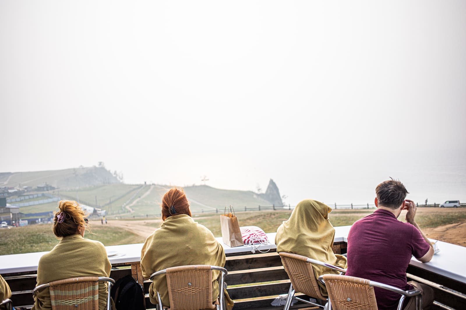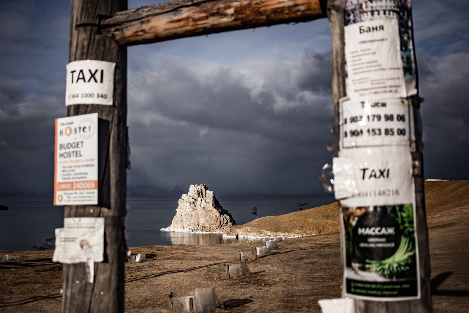 С другой стороны от остановки стоит киоск, там продают билеты до Ольхона. Рядом останавливаются маршрутные такси, которые едут до острова. Доехать на маршрутке в одну сторону стоит около тысячи рублей, до Хужира — 5,5 часа. Билеты можно также купить онлайн.