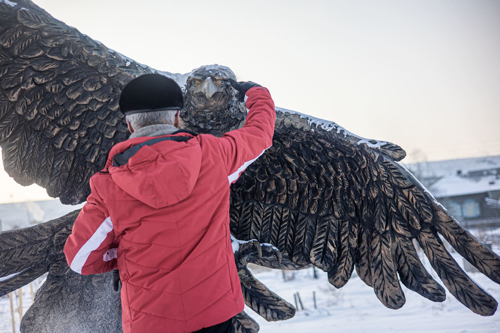 «Мама и папа у меня — буряты, я шаманист, а орёл — моё тотемное животное, — объясняет мэр. — Ну, вы много орлов в городе увидите. Скульптуры там, картины. Орёл — это такая птица-творец».