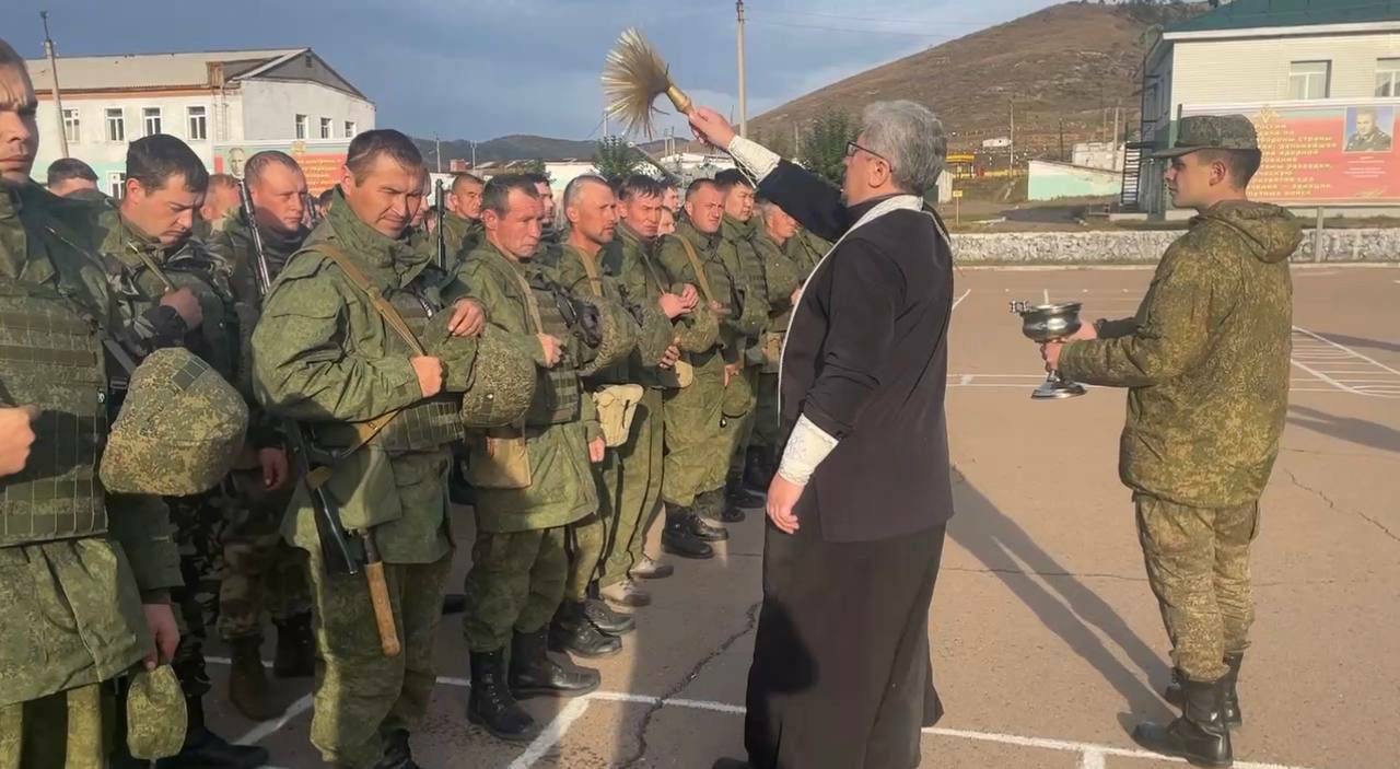 Священник благословляет первую группу мобилизованных на станции Дивизионная в Бурятии. Там дислоцируется 5-я танковая бригада.