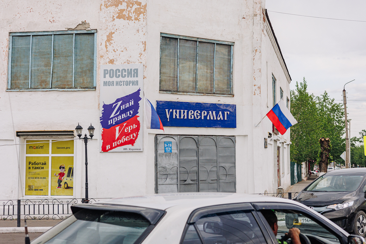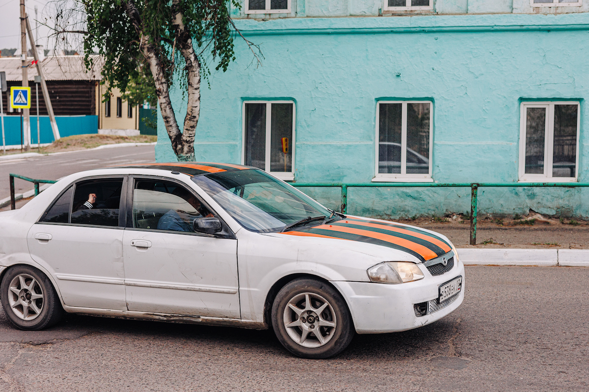 Фотограф отмечает, что в этом году патриотические символы уже приелись многим жителям Бурятии и Иркутской области. «Они вошли в повседневную картину миру, и на них либо не обращают внимания, либо их осуждают, — говорит наш собеседник. — Хотя есть и те, кто всё ещё с гордостью клеит наклейки „Своих не бросаем“ себе на машину».