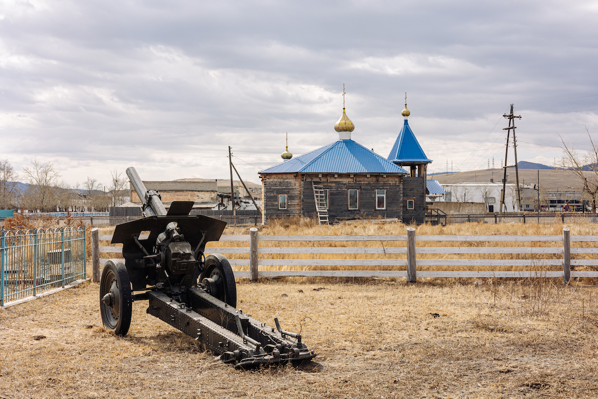 В России патриотизм часто связан с религией. В селе Селендума в Бурятии в 2018 году открыли сквер памяти земляков-военных, погибших в Чечне и Афганистане. С прошлого года в сквере стали появляться и портреты погибших в Украине. Рядом со сквером стоит гаубица времён Второй мировой войны, её подарила селу республиканская организация «Боевое братство». Дуло гаубицы (по всей видимости, случайно) развёрнуто в сторону православной церкви.