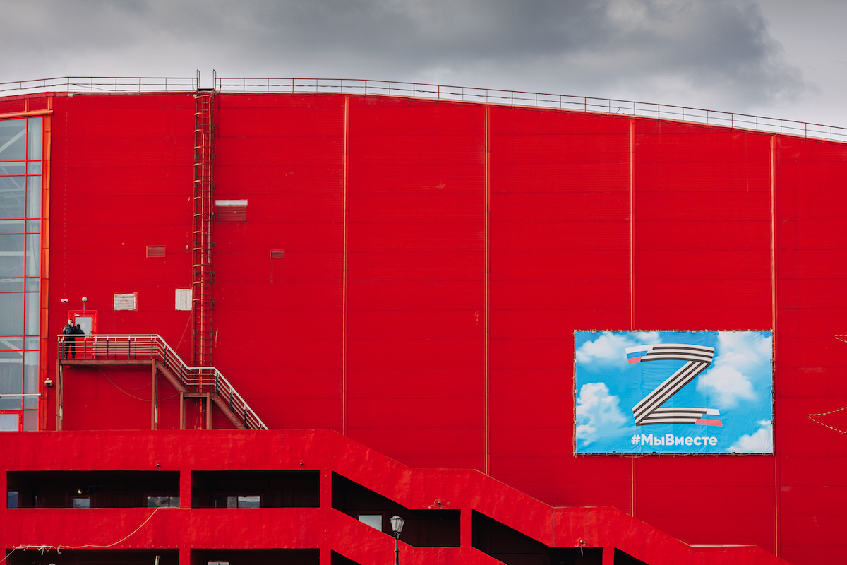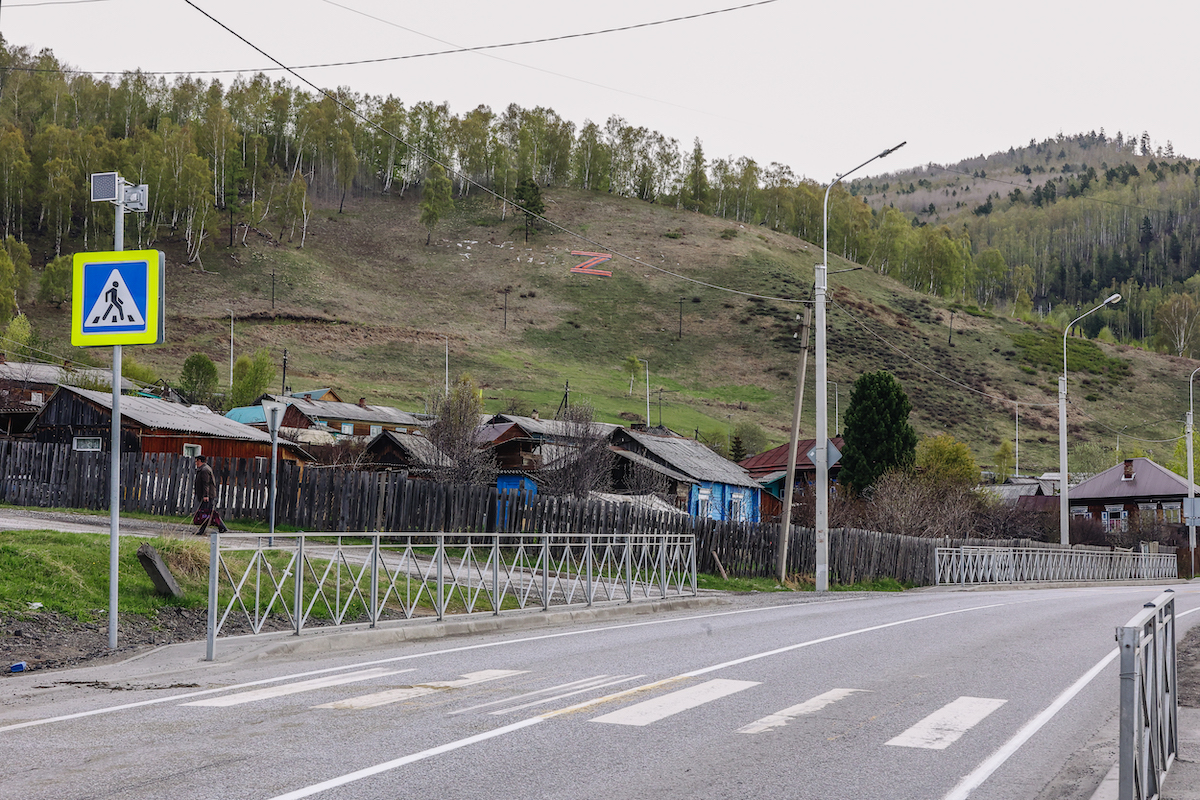 Иногда символы российского вторжения — буквы V и Z — приобретают гигантские размеры. В июле прошлого года их нарисовали на торце жилой пятиэтажки в Улан-Удэ. Жители сообщили, что это была инициатива управляющей компании.