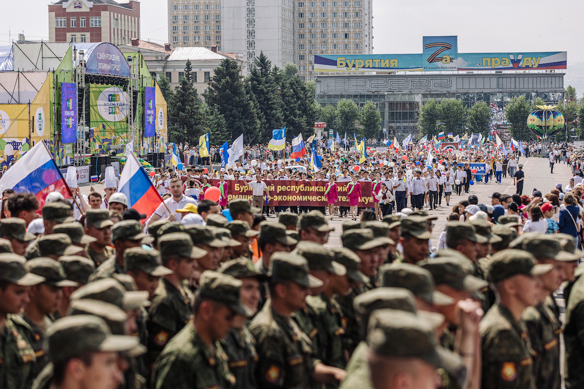 В городе Кяхте в Бурятии атрибуты патриотизма можно встретить на каждом шагу. Здесь дислоцирована 37-я мотострелковая бригада, которая участвовала в войне с первых дней. В Украине погибли десятки контрактников, и это ещё до начала мобилизации оказало сильное влияние на горожан. Местный журналист Александр Фарфутдинов называл настроение в Кяхте «подавленным» и «никаким». При этом Фарфутдинов говорил, что уровень патриотизма у горожан — «крайне высок».