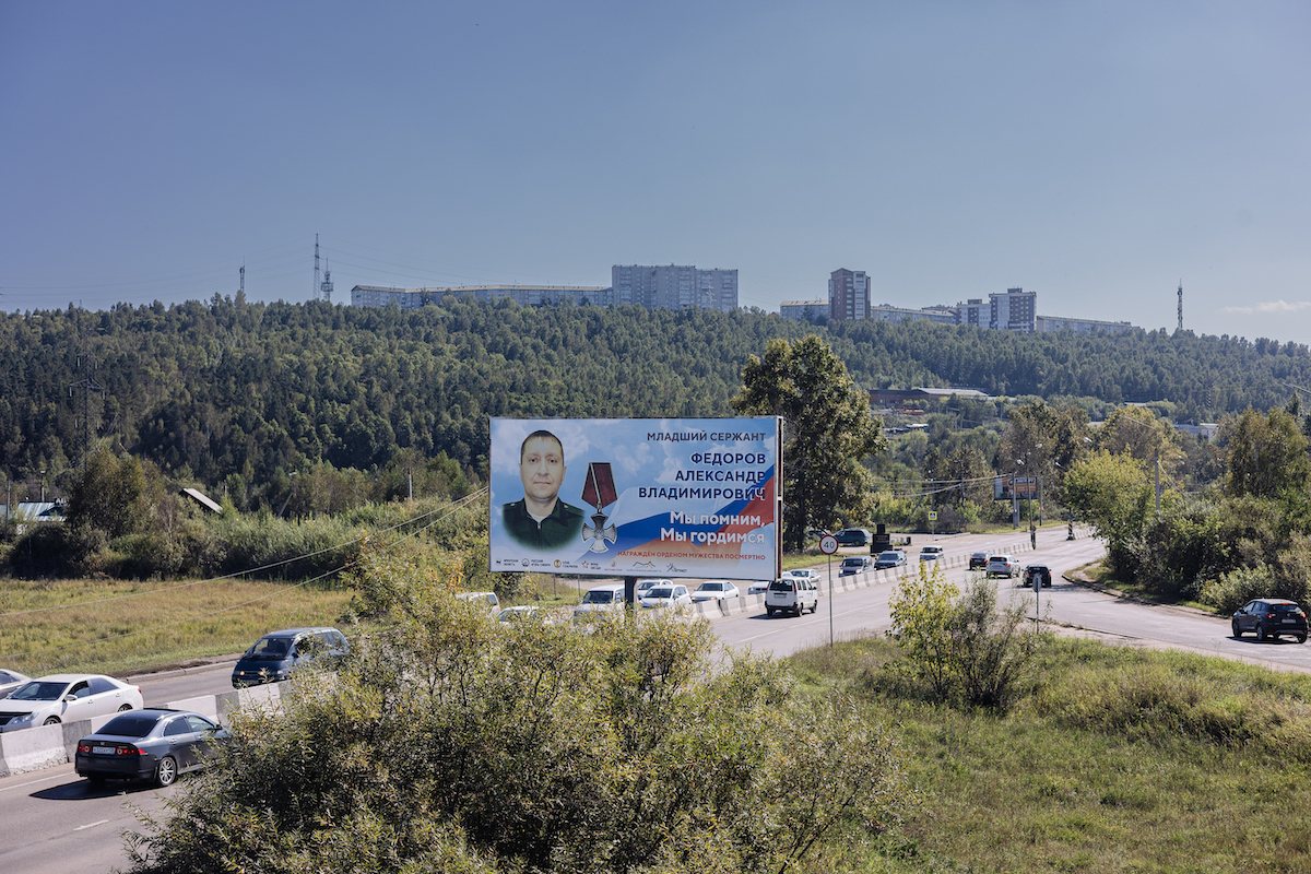 За последние полгода, по мнению автора фотографий, «патриотический» фокус в Иркутской области и Бурятии сместился. Вместо многочисленных растяжек с Z и V стали массово появляться баннеры, на которых рекламируют службу по контракту. Вместе с ними вешают баннеры с портретами военных, погибших в Украине и награждённых посмертно.
