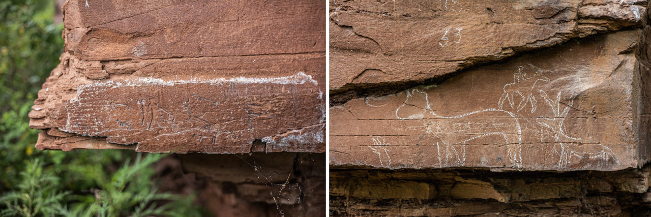 Площадок, с которых можно близко увидеть древние изображения, несколько. Больше всего рисунков — на ближайшей к селу. Чтоб посмотреть остальные, идём вдоль реки Тальмы и вглядываемся в скалы наверху. Есть изображения чёткие, есть еле заметные, мелкие и крупные. Некоторые обведены мелом учёными, которые приезжали сюда в экспедицию больше полувека назад. Благодаря скалам-навесам мел не смыло дождями. Место для укрытия человека действительно надёжное.