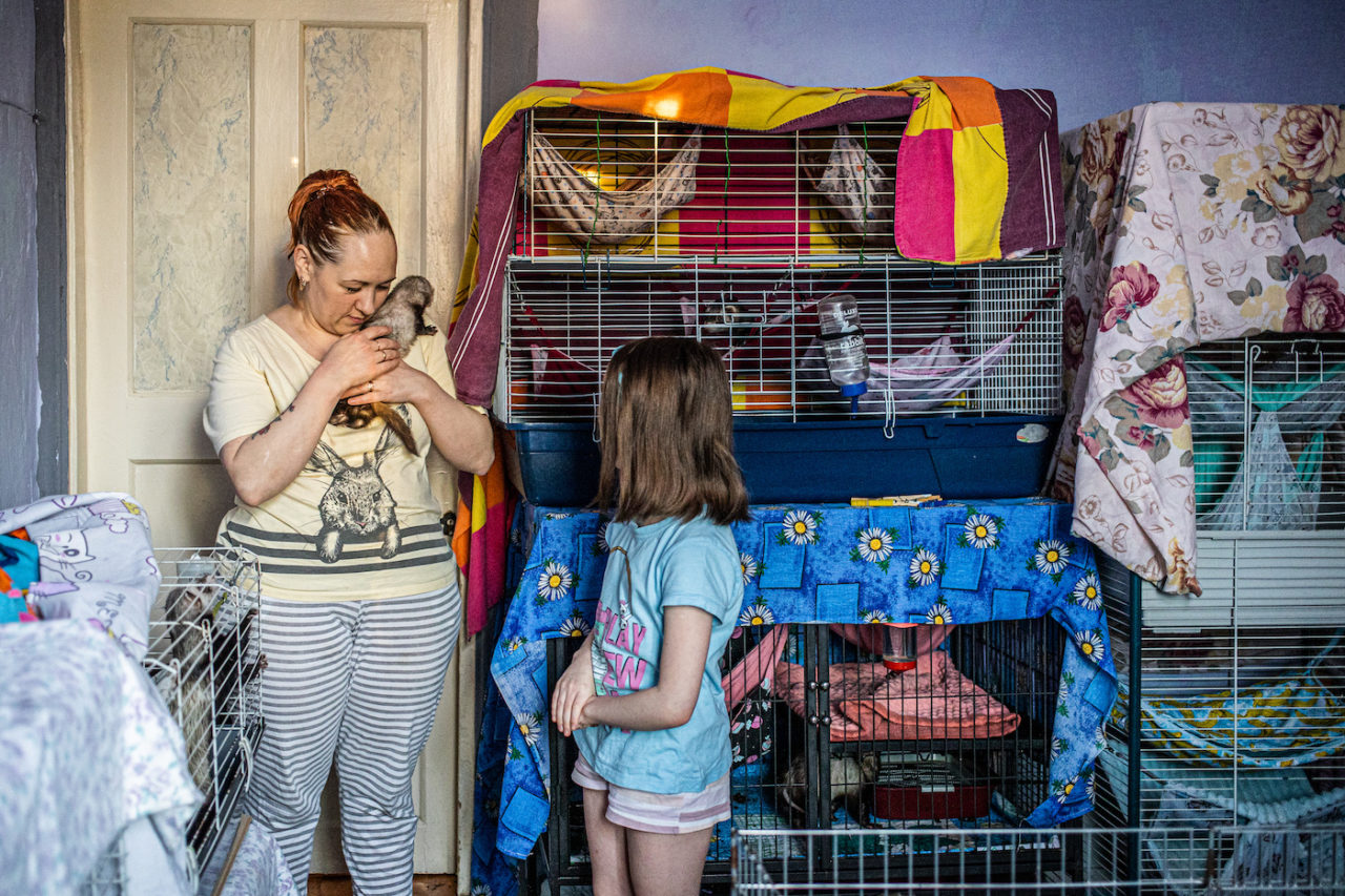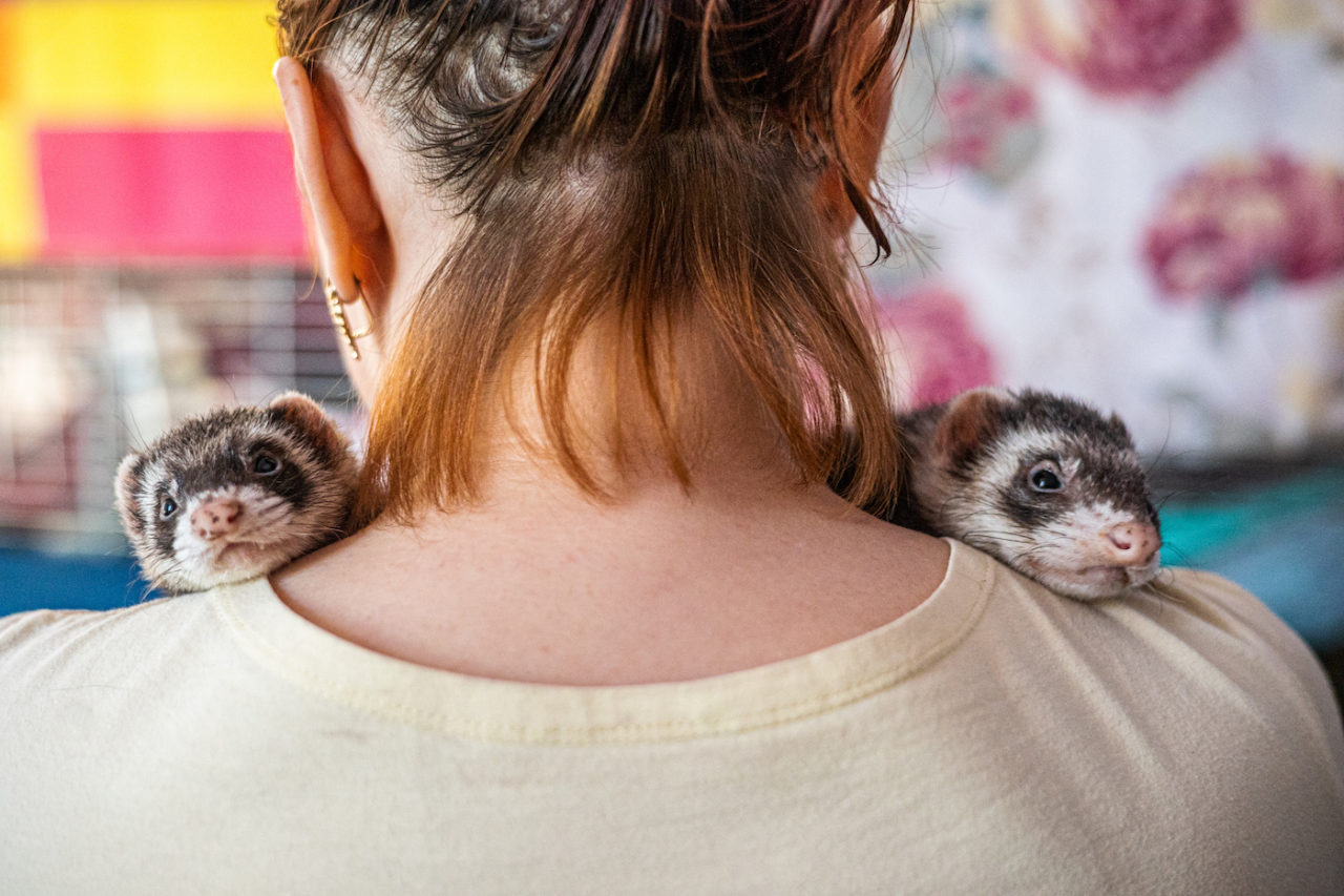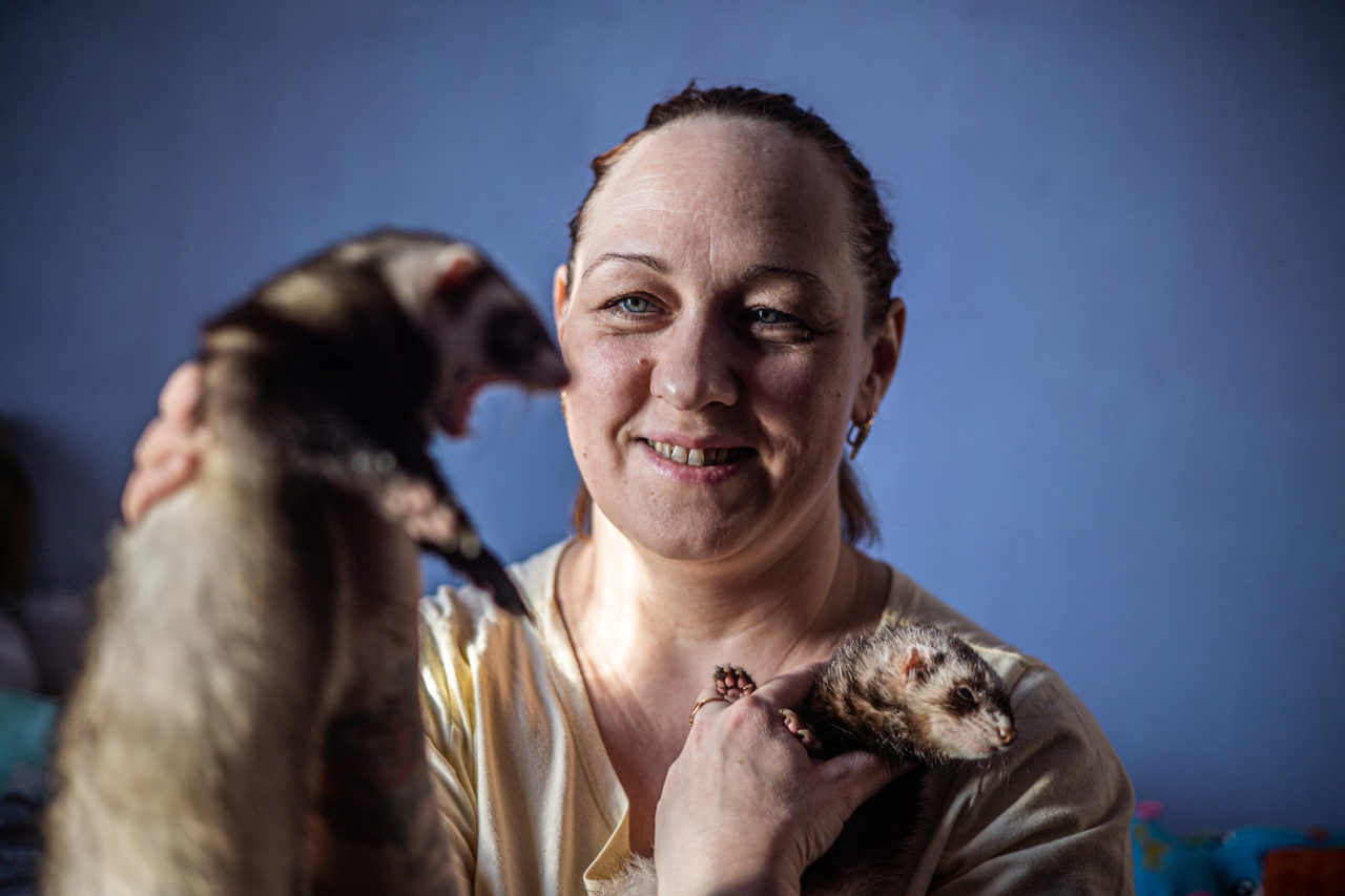 Когда мы входим, за решётками начинается шевеление. Одна за другой через прутья высовываются розовые мордочки. Все тянутся общаться, просятся «погулять». Во время разговора Анна Чуринова одного за другим вытаскивает хорьков из клеток, держит на руках или сажает в вольеры. Она не только различает всех, но помнит и рассказывает историю каждого из них. Анна — невысокая женщина с тёмно-рыжими волосами, собранными в пучок. Ей 41 год. На правой руке от запястья до локтя у неё цветная татуировка с изображением хорька.