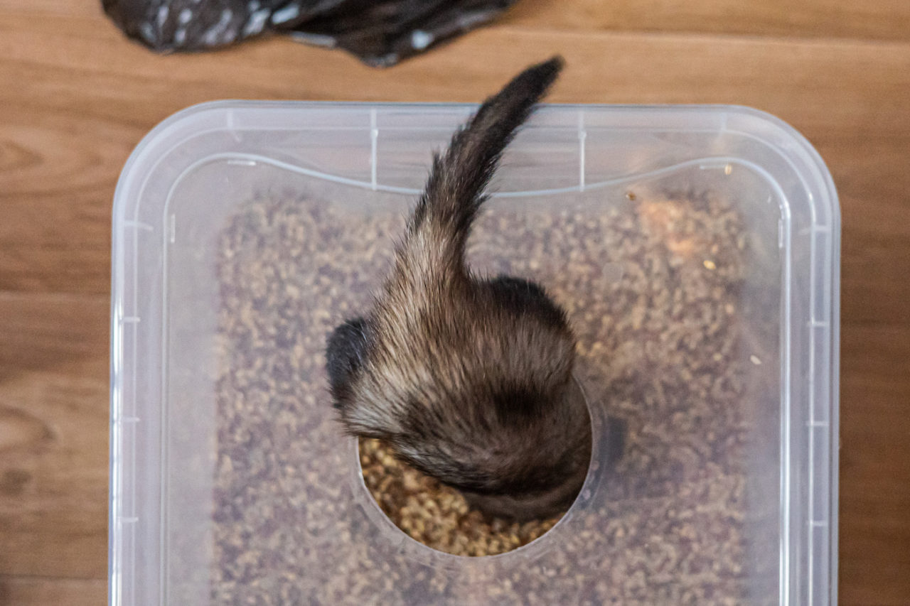 Хорёк может съесть за один раз одну-две мыши. Но в основном их едят норки и ласки. Многие хорьки после неправильного кормления у старых хозяев едят кошачий корм. Анна покупает его суперпремиум класса. Едят также утку, куриные голени, крылья, мясо перепёлок, куриные потрошка — сердце, желудок, шейки — филе кролика, индейку. Питание не должно быть однообразным, говорит Анна.
