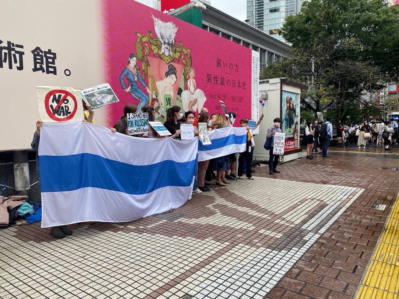 У нас есть девушка — очень заметная, красивая — она спонтанно скандировала речёвки на трёх языках, мы за ней повторяли. Молодёжь сообщила о нашей акции японским журналистам. От них стали раздаваться реплики: «Кроме слоганов, скажите что-нибудь связное». Поскольку никто не решался, я вышла и произнесла речь на японском. Сказала, что Япония — всё-таки демократическая страна, и это замечательно. Мы благодарны за возможность здесь выступить. Возможность, которой в России сейчас нет. Что мы русские, но мы против войны, и открыто это заявляем. «Свободу России!», «Мир Украине!».