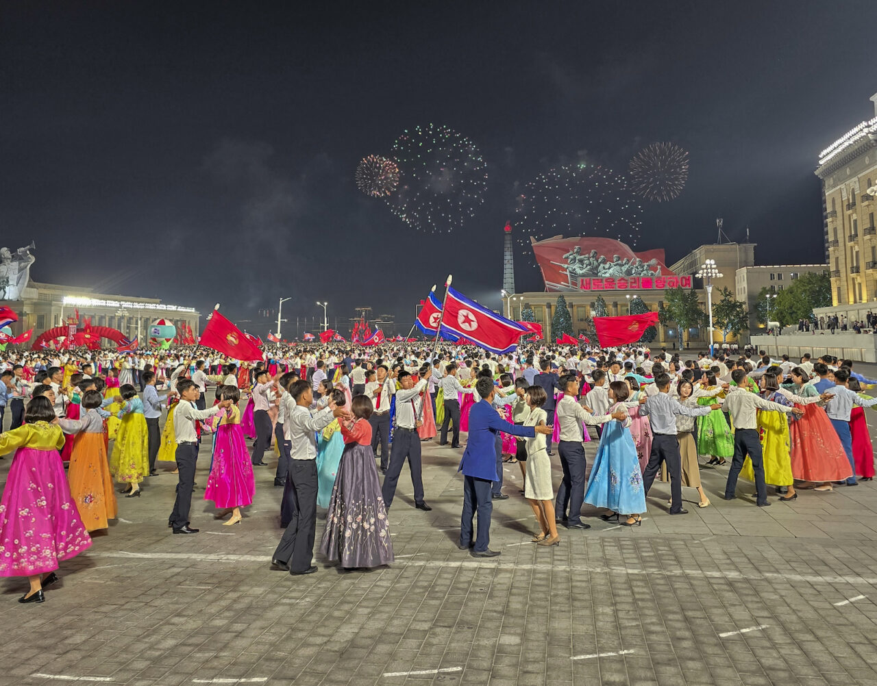 Вечером 31 декабря на главной площади Пхеньяна собрались несколько десятков тысяч северокорейцев. Большая часть людей стояли на трибунах, пока молодые пары танцевали внизу, выстраиваясь в гигантские хороводы.