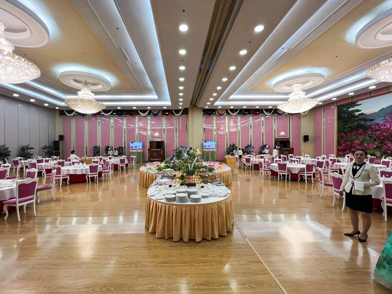Отель выглядел новым, правда, обставлен был в духе тенденций двадцатилетней давности: дерево и плавные линии вместо бетона и прямых углов. По словам Александра, бросалось в глаза, что принимать туристов там не привыкли. Например, сотрудники не знали, сколько нужно заплатить за купоны на посещение бассейна в отеле: цена была указана в корейских вонах, но у гостей были только доллары и юани. Иностранцам никогда не дают в руки местные деньги, и они покупают всё за валюту.