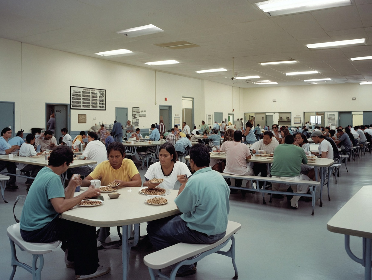 Альтернатива: лапша быстрого приготовления, чипсы и шоколадки в тюремном магазине, которые стоят в полтора-два раза дороже, чем на воле. Деньги на них могут отправить родственники, либо иммигрант может устроиться на работу в детеншене: стирать, готовить, убирать корпуса. Но платить ему будут всего доллар за смену. То есть работать на одну шоколадку придётся почти неделю. Из развлечений: настольные игры, шахматы и библиотека с книгами на английском и испанском, по расписанию прогулки во дворе, который похож на бетонную коробку без крыши. «Резиденты», как официально называют жителей детеншенов, могут получать посылки с книгами: Адисо отправляет Тумэну научную фантастику с «Амазона».