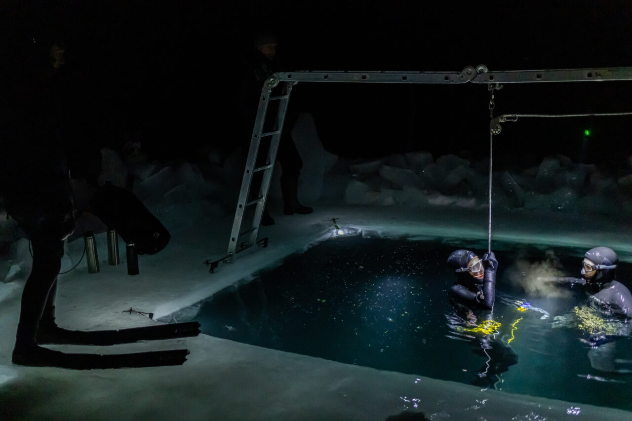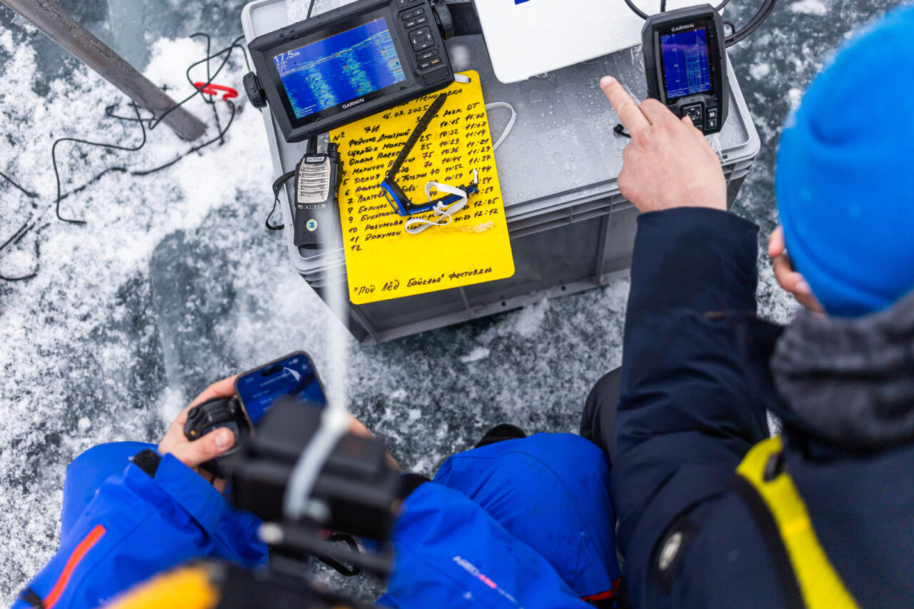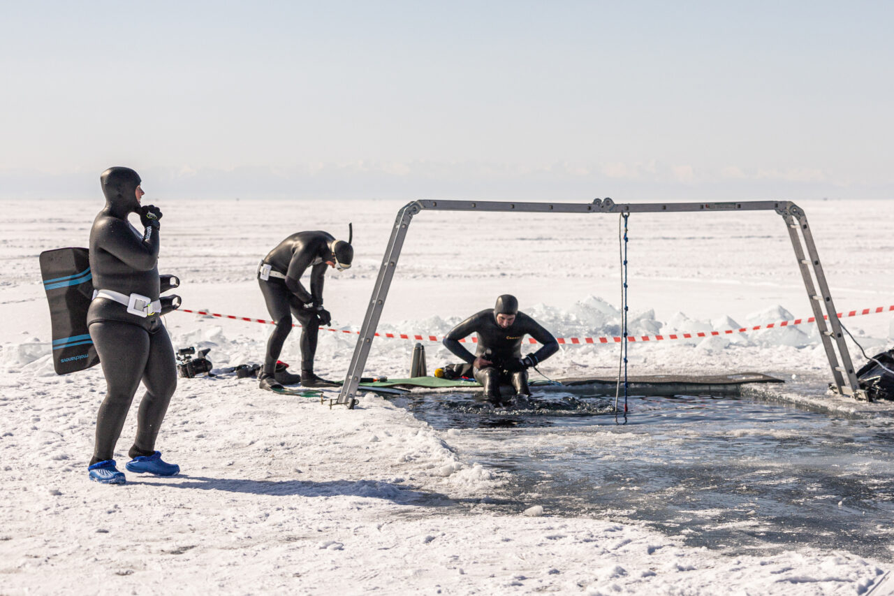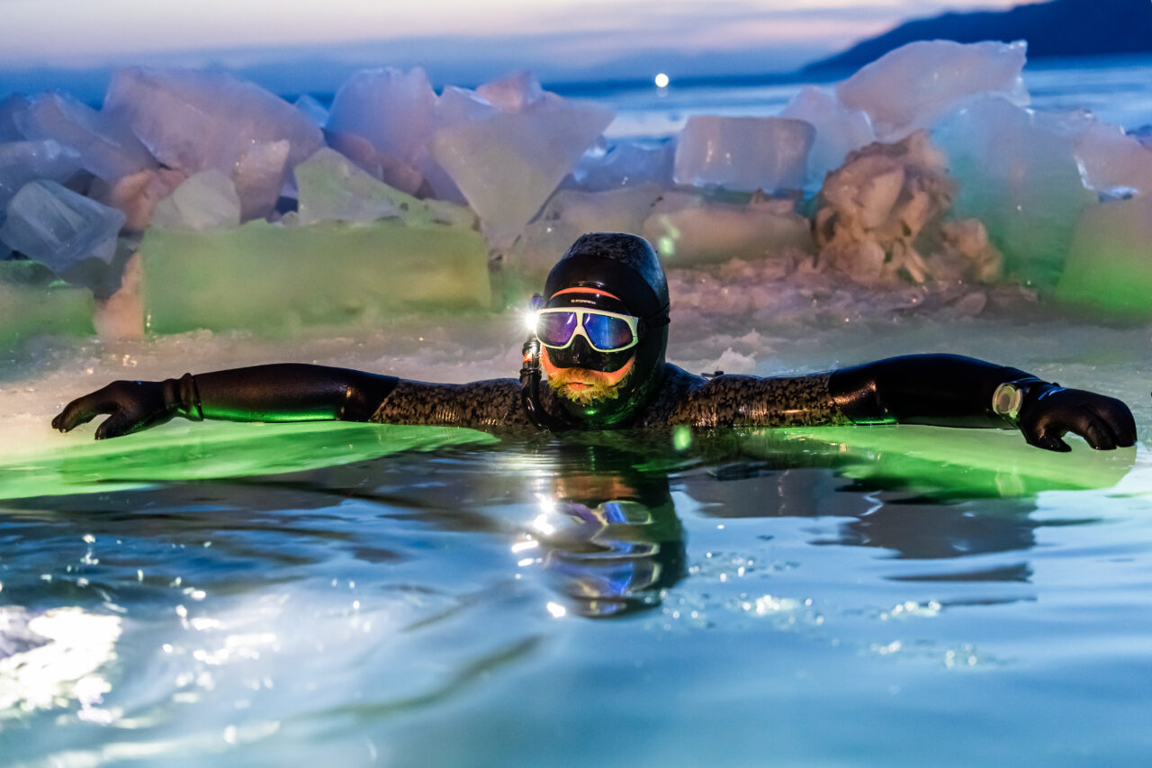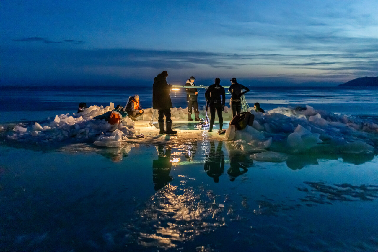 На льду и под водой установили специальное освещение. Толща воды при свете фонарей выглядела зелёной. Только звёзды в небе, лёд Байкала, прозрачная глубина. Место, где ставят рекорды.