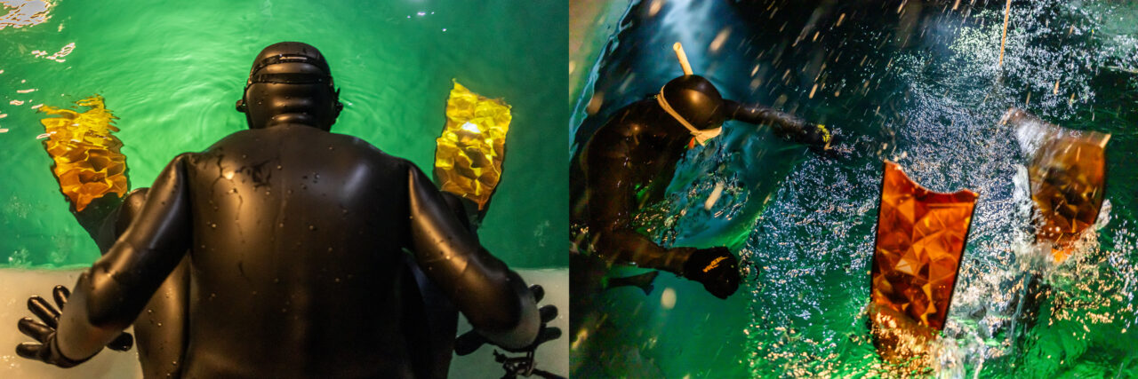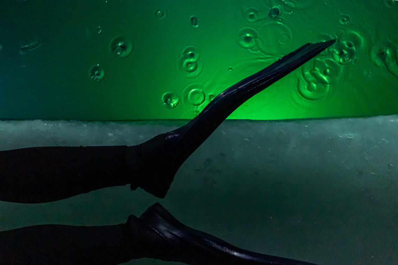 В первый день соревнований Ольга Маркина (на фото её моноласта) побила свой собственный рекорд для женщин из книги Гиннеса — в моноласте она нырнула под лёд на глубину 71 метр. Её предыдущий рекорд — 63,8 метра.