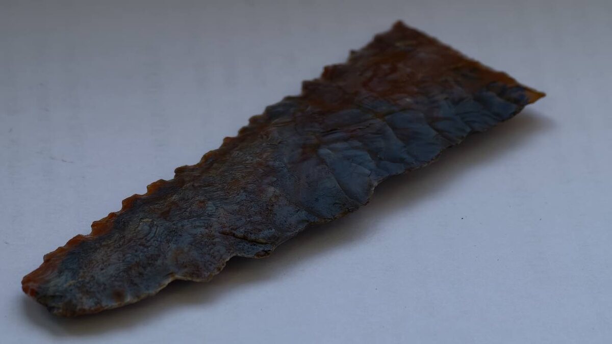 Инструмент, выточенный из кремня, был аккуратно обработан: сначала заготовку грубо оббили, а затем от неё осторожно отщепили тонкие пластинки, чтобы создать острую кромку. Несмотря на древность, она до сих пор остаётся острой — настолько точно и умело была сделана.