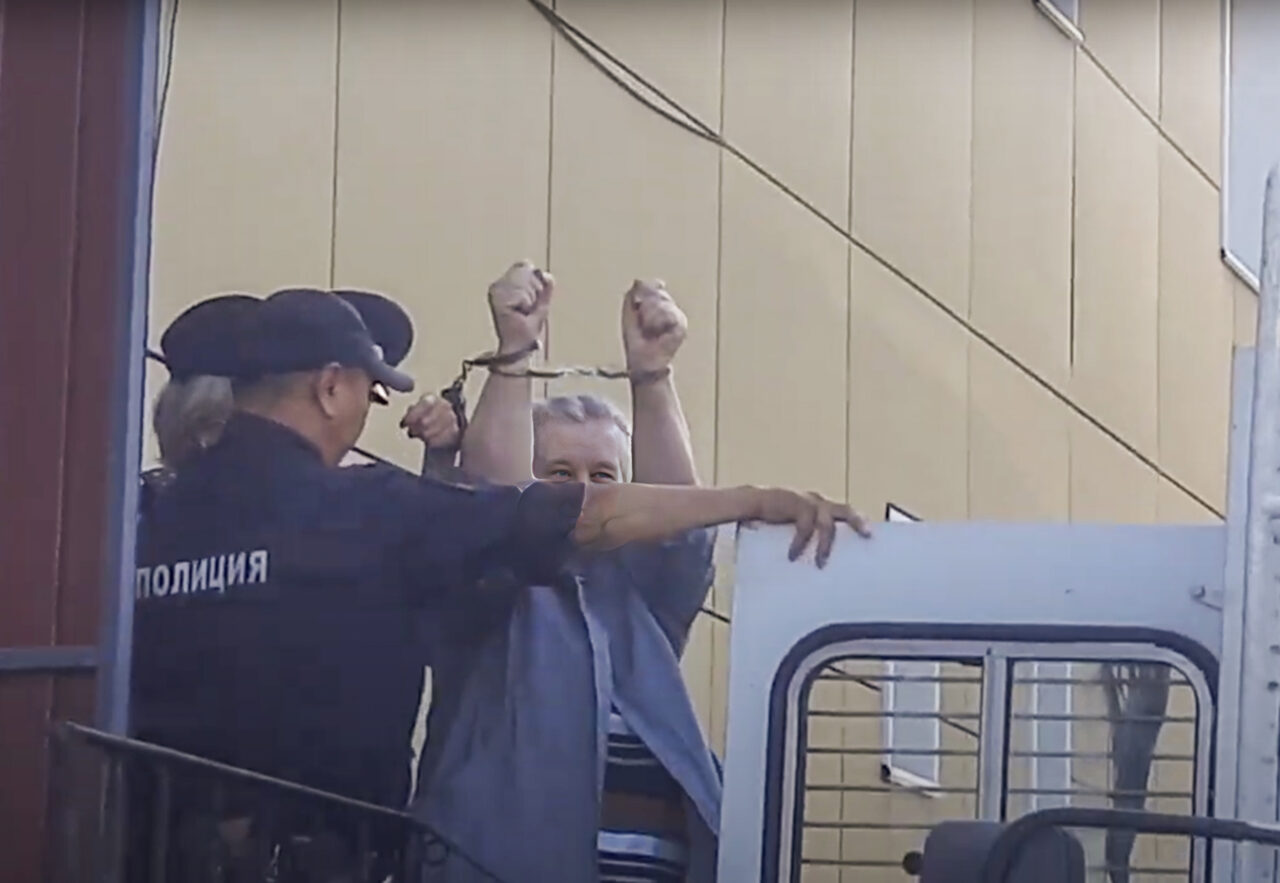 Подняв вверх зажатые в кулаки руки в наручниках, Наталья приветствовала людей, которые после приговора пришли проводить её на задний двор суда.