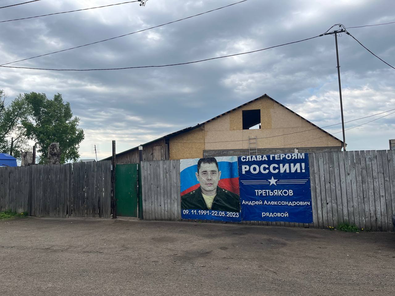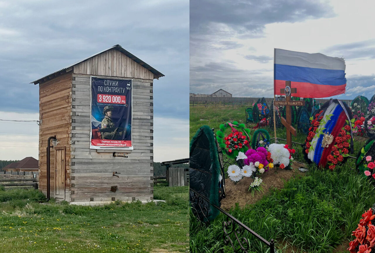 Магазин стоит в конце центральной улицы Бадая. Дальше — кладбище, на котором издалека видно флаг России. Его установили на могиле 48-летнего Александра Кравченко. Он погиб на войне зимой прошлого года. На этой же улице, ведущей к кладбищу, стоит деревянная водокачка, на стене — баннер с рекламой службы по контракту. Крупными буквами на нем написано: «Служи по контракту. 3 920 000 рублей за первый год службы по контракту в зоне СВО».