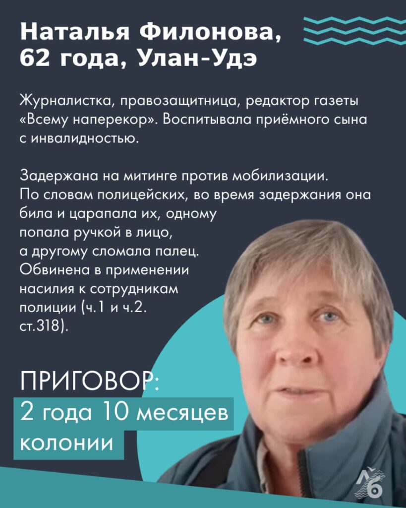 Другая журналистка, Наталья Филонова из Бурятии, отсидела 2 года и 10 месяцев по обвинению в нападении на четырех полицейских. До этого она 12,5 лет выпускала собственную газету «Всему наперекор», была депутатом Петровск-Забайкальской районной думы и боролась против закрытия малокомплектных школ. Филонова воспитывала приемного сына с инвалидностью, которого на время следствия и ареста отправили в детский дом. Арестовали журналистку после публичного выступления на площади в Улан-Удэ в сентябре 2022 года: тогда Наталья заявила, что хочет сорвать мобилизацию и остановить войну. По словам конвоировавших ее полицейских, по дороге в суд Филонова их била, царапала, одному попала ручкой в лицо, а другому сломала палец. 64-летняя Наталья Филонова вышла на свободу в мае 2025 года. «Я села за то, что призывала к миру. Теперь за столом переговоров сидят политики, которые говорят о мире. Я считаю, что добилась своего — меня услышал мир!» — сказала Наталья, едва выйдя из колонии.