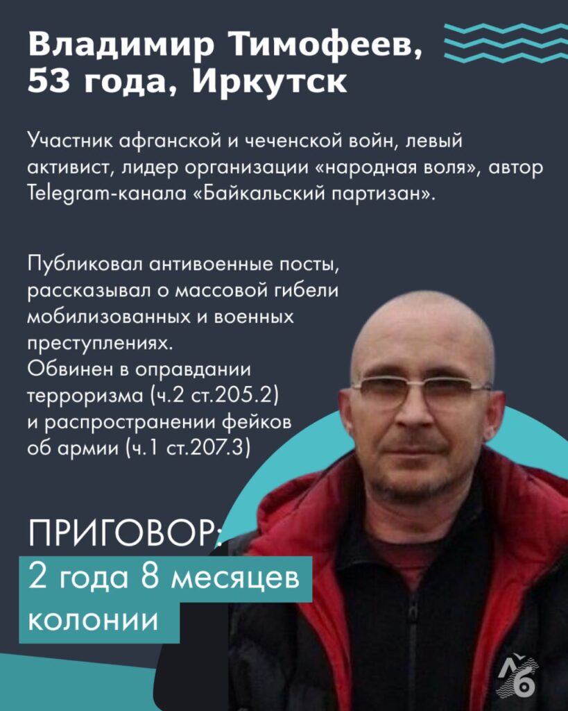 В апреле 2023 года участник афганской и чеченской войн, левый активист и блоггер из Иркутска Владимир Тимофеев получил 2 года и 8 месяцев колонии за оправдание терроризма и распространение фейков о российской армии. Поводом для уголовного дела стали публикации в его Telegram-канале «Байкальский партизан» об ударе украинской авиации по нефтебазе в Белгородской области. Тимофеев в ней положительно оценил боевые навыки украинских летчиков.