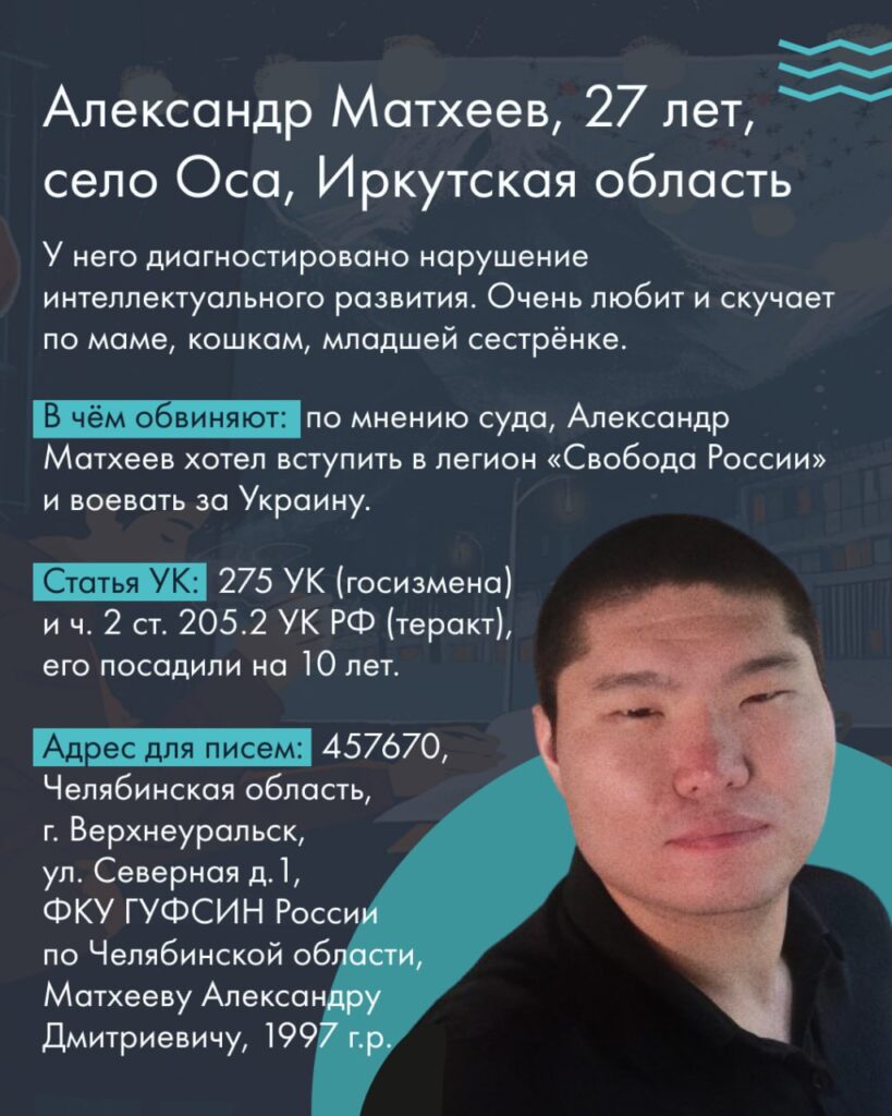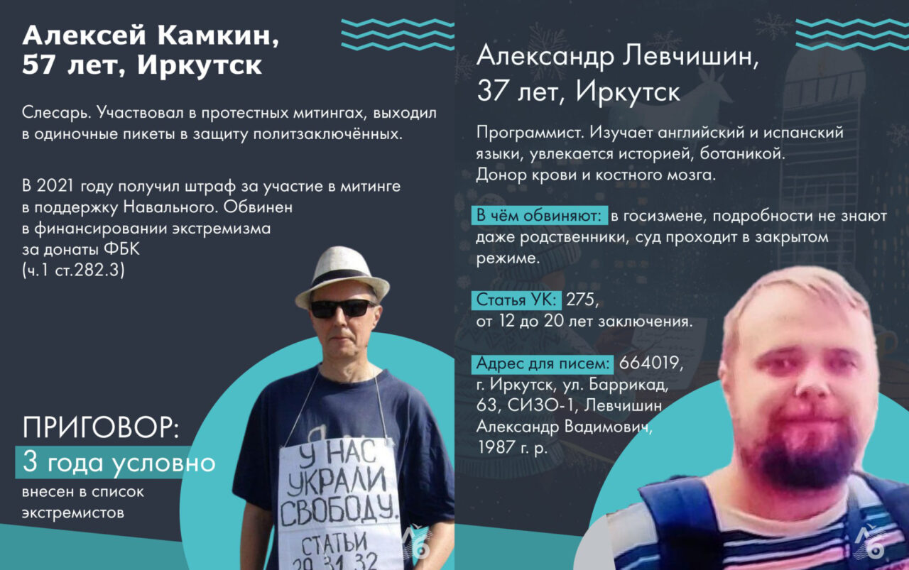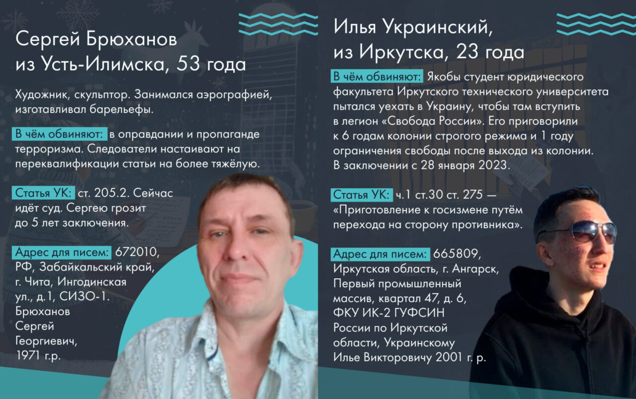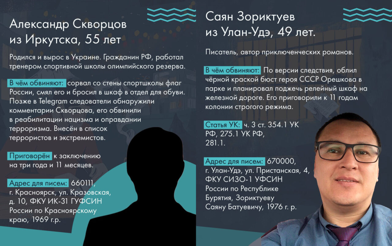 Конечно, описанные в статье дела — далеко не все, случившиеся с начала войны в Иркутской области, Бурятии и Забайкалье. Однако это вся информация, которая нам доступна. Если вы хотите поддержать сидящих в тюрьме, вы можете писать им письма. Почтовые реквизиты большинства мы указали на карточках с их фотографиями. Писать письма безопасно, но имейте в виду, что их читает тюремный цензор, так что лучше избегать резких формулировок. Часто заключенные говорят, что им нравится читать об отвлеченных вещах — о ваших хобби или путешествиях.
