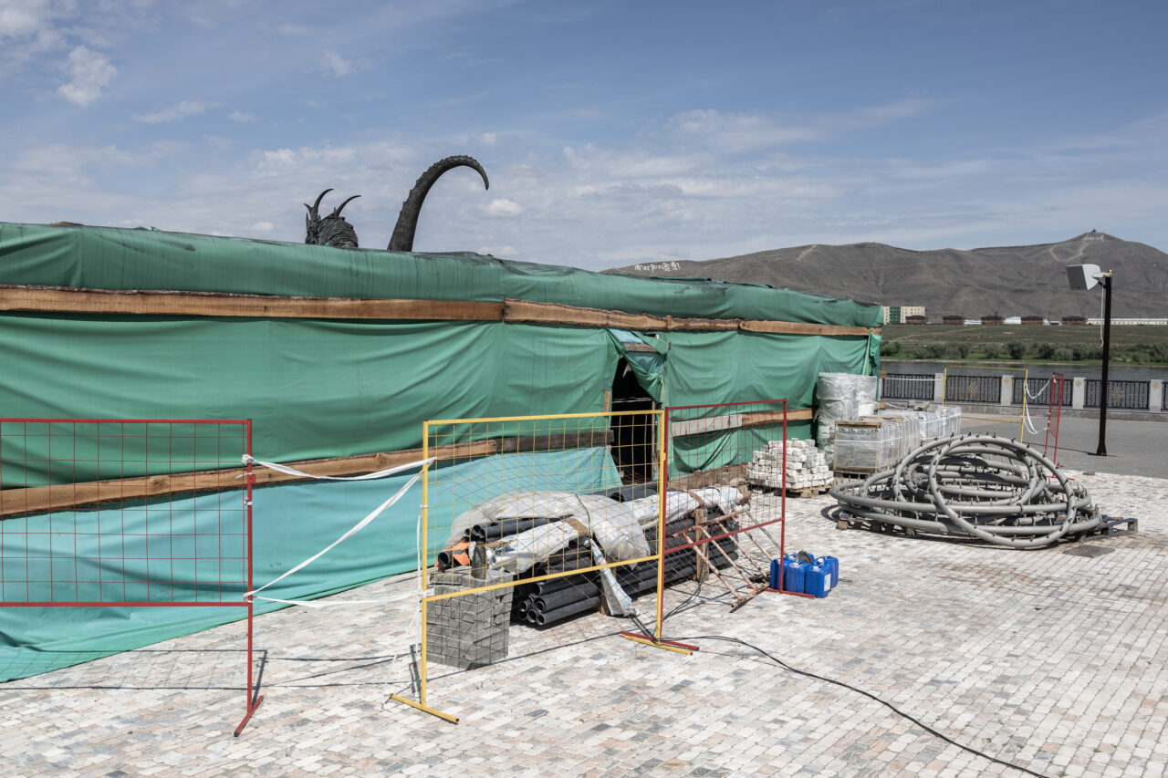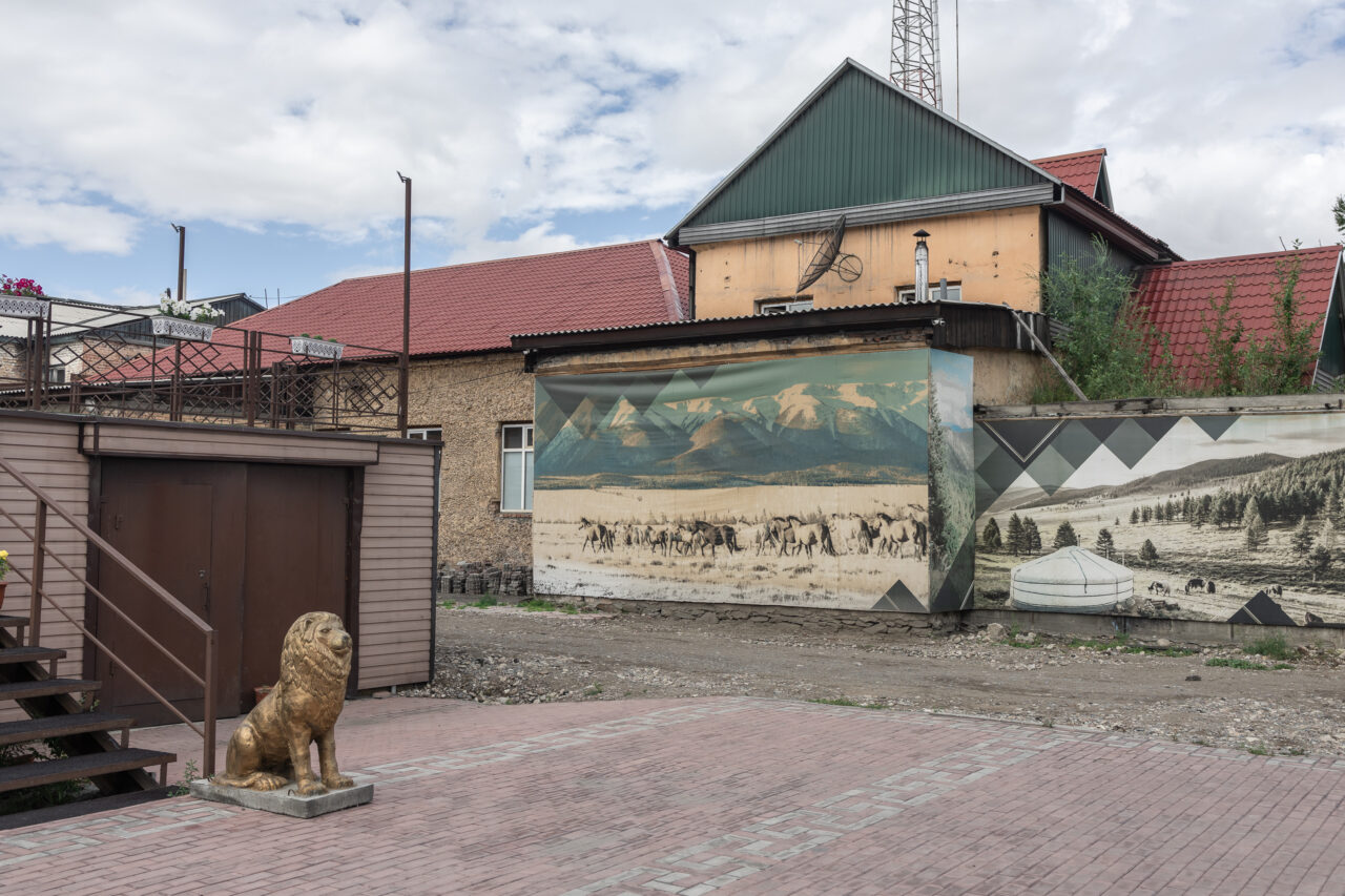 Часть площадки заасфальтирована, часть — засыпана гравием. Парковка огорожена забором из синего и бордового профлиста разной фактуры и размера. Внизу забора видны вмятины от неудачных парковок автомобилей. Когда журналисты «ЛБ» с Аяной приехали к этому месту, там не было ни одной машины. В этот ресторан нельзя прийти просто так и заказать столик. Ресторан открывается, когда гости справляют большие праздники, — юбилеи, свадьбы.